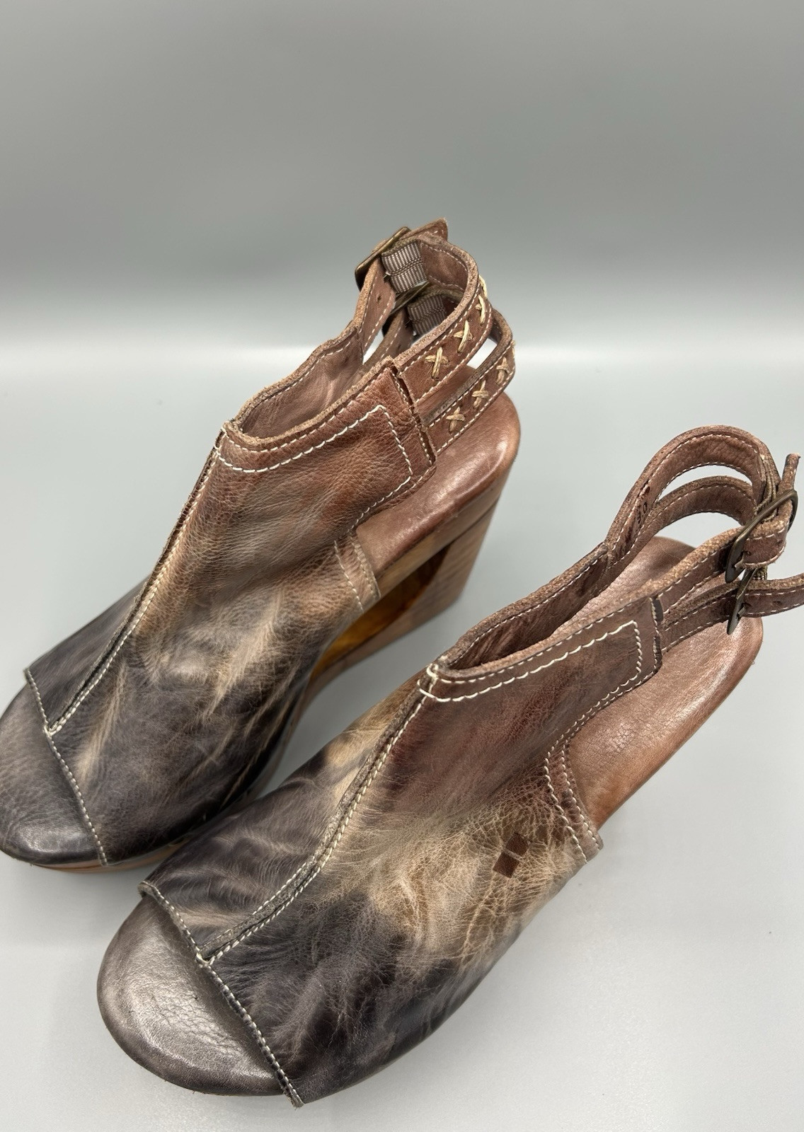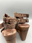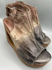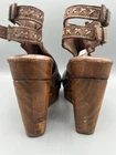 Authentic! Any imperfections shown in photos (slide 8). New without box. US women's size 9. Color: starry night tie dye. Vegetable tanned leather. Sustainably sourced wood wedge with unique cut out. Metal stud accents. Adjustable dual straps with metal buckles. Cushioned insole for a comfortable step. 4.5 inch heel. 1.5 inch platform. Open-toe design.