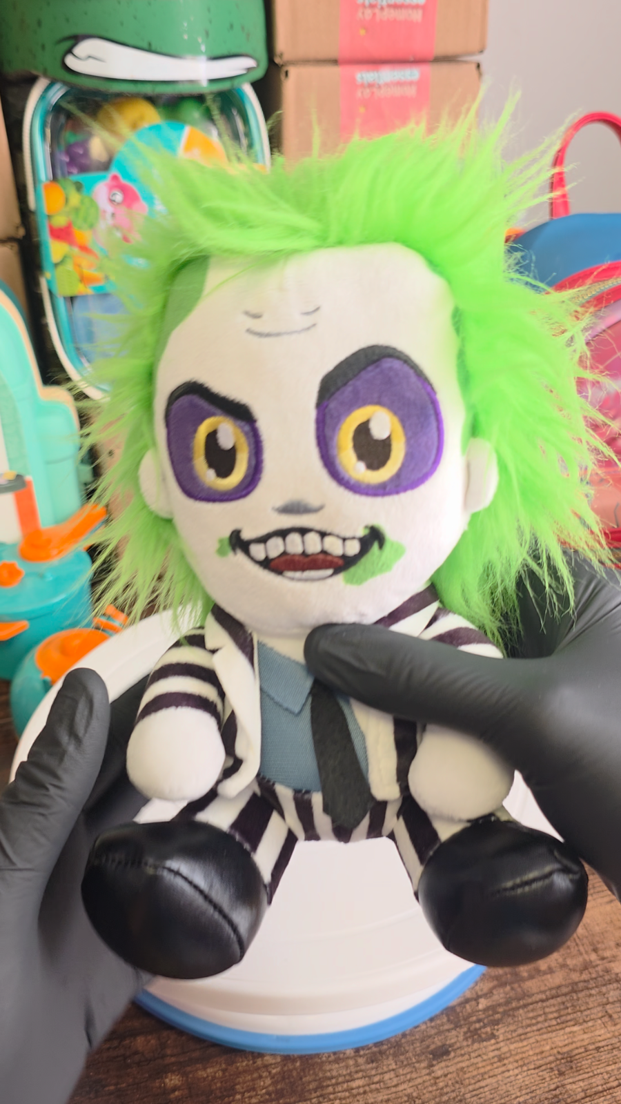Welcome the ghost with the most into your home with this fantastic Kidrobot Phunny Plush of BEETLEJUICE! This collectible 7.5-inch plush perfectly captures the "bio-exorcist" from the iconic Tim Burton movie. He’s detailed right down to his spiky green hair, signature black and white striped suit, and mischievous grin. A genuine Kidrobot Phunny item, this soft doll is a must-have for any horror, movie, or pop culture collector. Whether you’re a long-time fan of the classic film or just looking for a quirky, high-quality plush, this "Ghost with the Most" is ready to haunt your collection. Don't miss out on owning this rare and recognizable piece of movie history! Perfect for display or as a unique gift. •Iconic Character Design : Captures the classic look of Beetlejuice from the Tim Burton film, including the spiky green hair and striped suit. • Collectible Kidrobot Phunny Line: Part of the highly sought-after Phunny Plush collection known for its unique, stylized take on pop culture icons. • Perfect Size : At 7.5 inches tall, it's ideal for display on shelves, desks, or alongside other plush collectibles. • High-Quality Details : Features embroidered facial details, including the purple-shadowed eyes and signature grin. • Great Gift for Fans : A must-have item for any fan of the Beetlejuice movie or horror-comedy memorabilia.