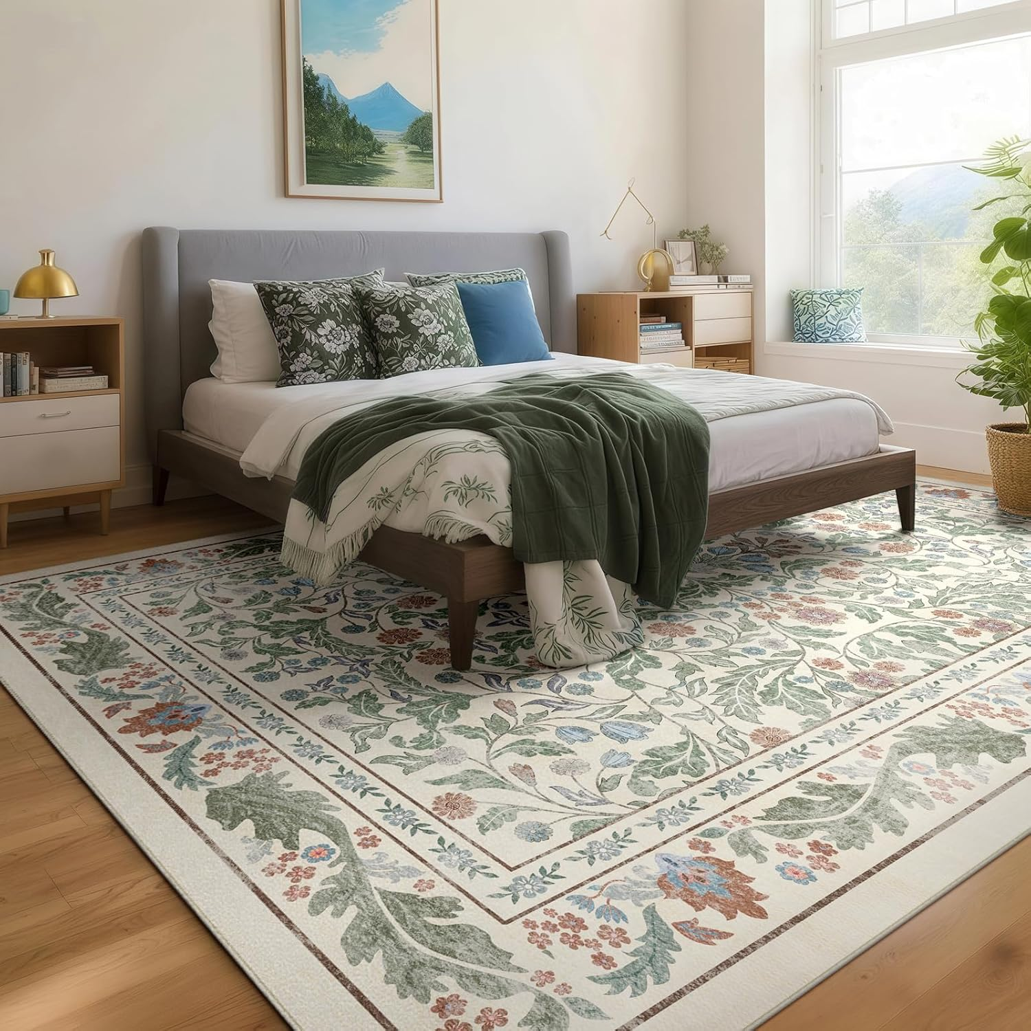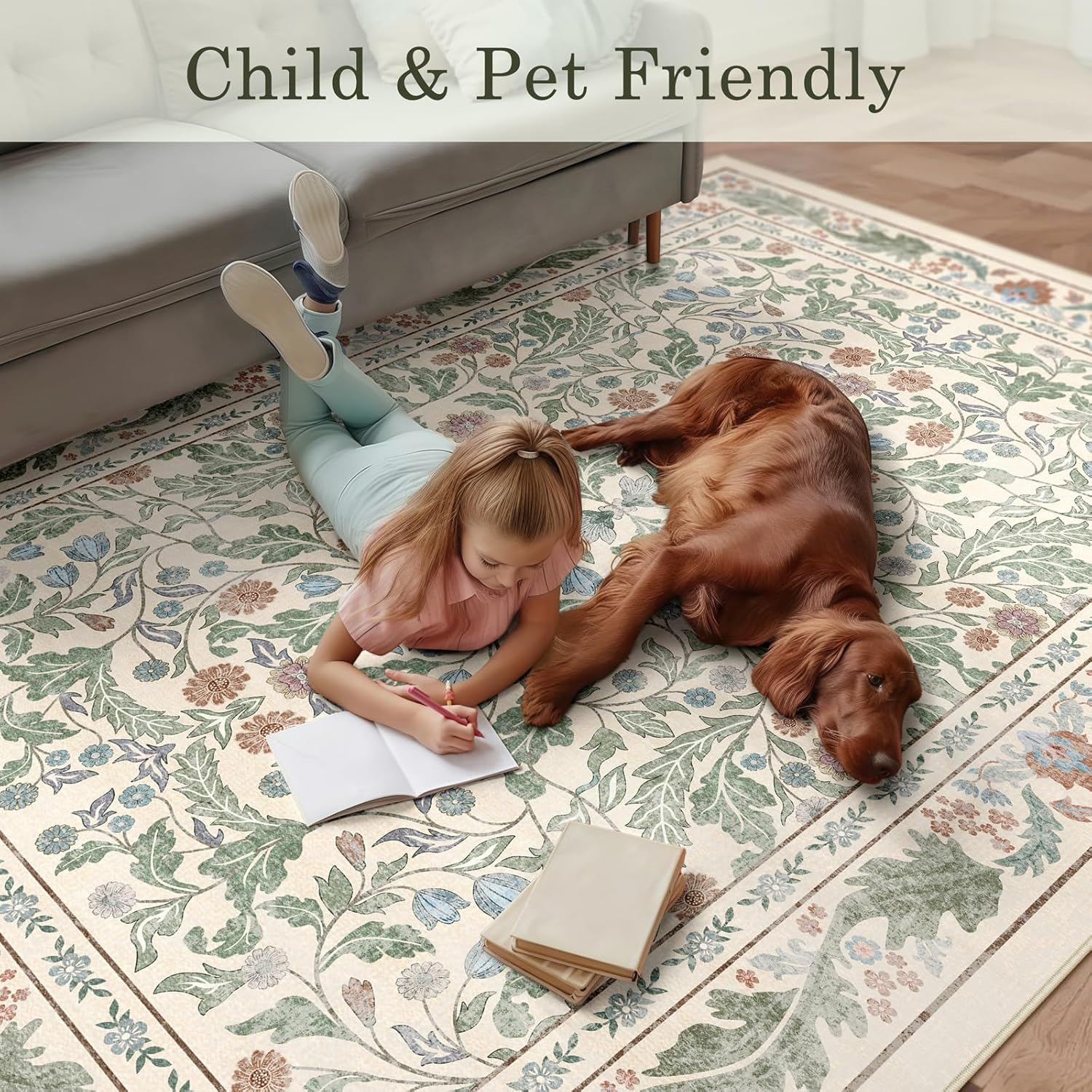 $ 53.898X10 Washable Area Rug Vintage Green Rug for Living Room Bedroom Low Pile Soft N