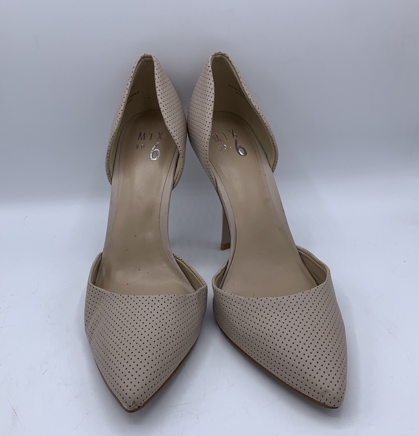 Elevate your fashion game with these stunning Mix No. 6 beige nude high heels. These stilettos have a pointed toe and a sleek patent leather upper that exudes elegance. The comfortable heel height of 3-3.9 inches and under 1-inch platform height make them perfect for any formal occasion, be it a wedding or a cocktail party. The Mix No. 6 heels come in size 9.5 for US and UK, and size 9.5 for AU. The outsole material is made of faux leather, while the insole and lining materials are synthetic. These pumps are a great addition to any classy wardrobe, and the pointed toe stiletto style will make you stand out in a crowd.