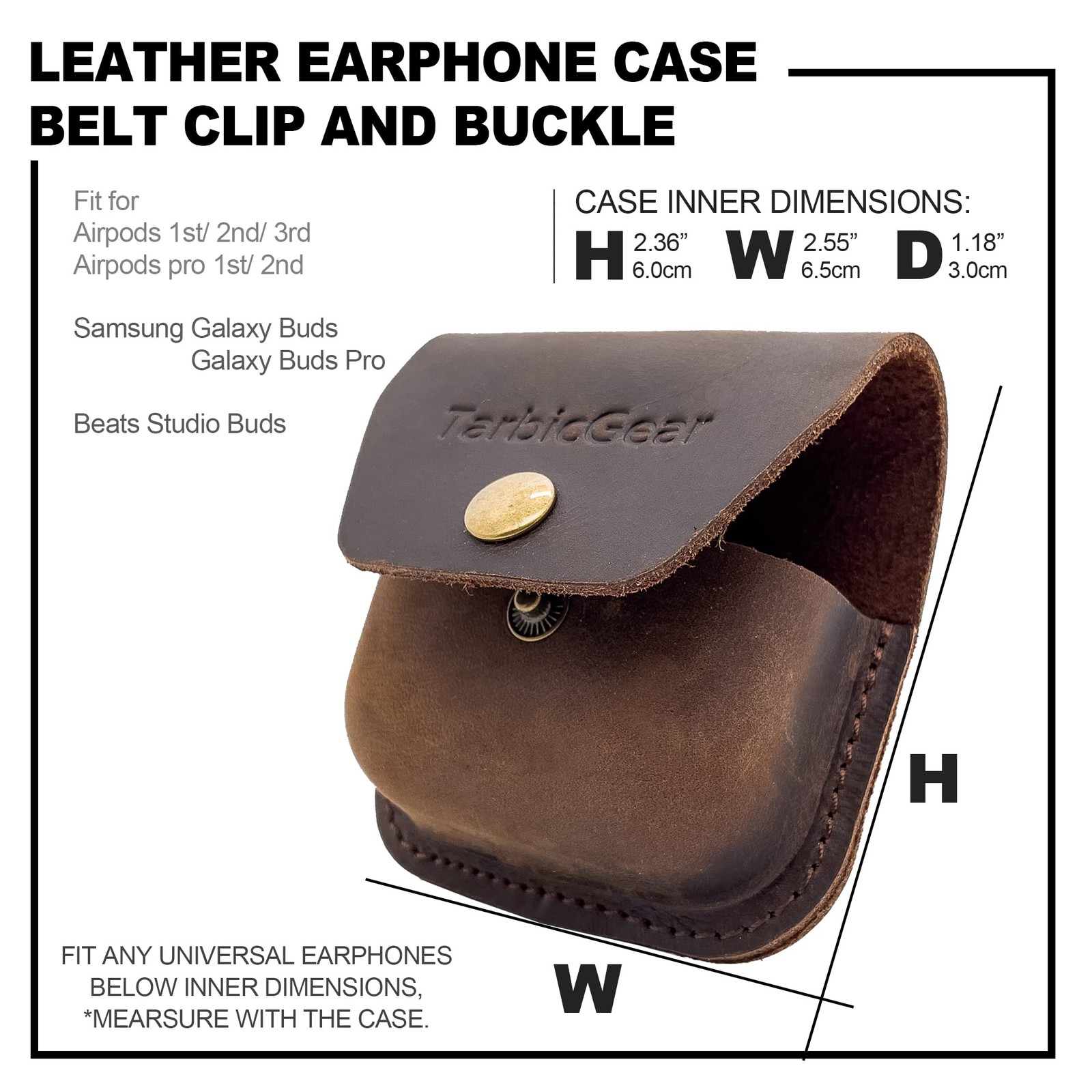 Genuine Leather: Crazy Horse Leather is made by applying wax to full-grain leather surface, leather's natural color changes its shade that gives the antique and vintage appearance. Portable: Belt Clip & Buckle design make it easy to carry your Airpods anywhere, Perfect for EDC use and outdoor activities like hiking... High Compatibility: Leather Earphone Case didn't made from a specific size for one earphone model. With it's size, this earphone case fit for Airpods 1/2/3rd Generation, Airpod Pro 1/2nd Generation, Samsung Buds, Beats Studio and also some other which within the size. High Compatibility: Designed to fit airpods 1st/2nd/3rd generation, airpods pro 1st/ 2nd generation, Samsung Galaxy Buds, Beats Studio Buds, and earphone size within the case's inner dimension (2.55 inches (6.5 cm) * 2.36 inches (6 cm) * 1.18 inches (3 cm)). Belt Clip Design: The belt clip design of this earphone carrying case allows you to attach it to your backpack, waistband, or other places for easy access and portability. Protective and Stylish: Made of durable crazy horse leather, this earphone pouch provides comprehensive protection against scratches, dings, and other daily wear and tear while adding a touch of style to your earphone. Lightweight and Pocket-Size: At only a few ounces, this leather earbud case is lightweight and compact, making it the perfect solution for on-the-go protection for your earphone. Elegant and Unique: With its sleek design and high-quality materials, this leather earphone pouch offers a touch of elegance and individuality to your earphone while keeping it secure and protected.