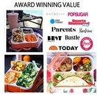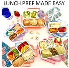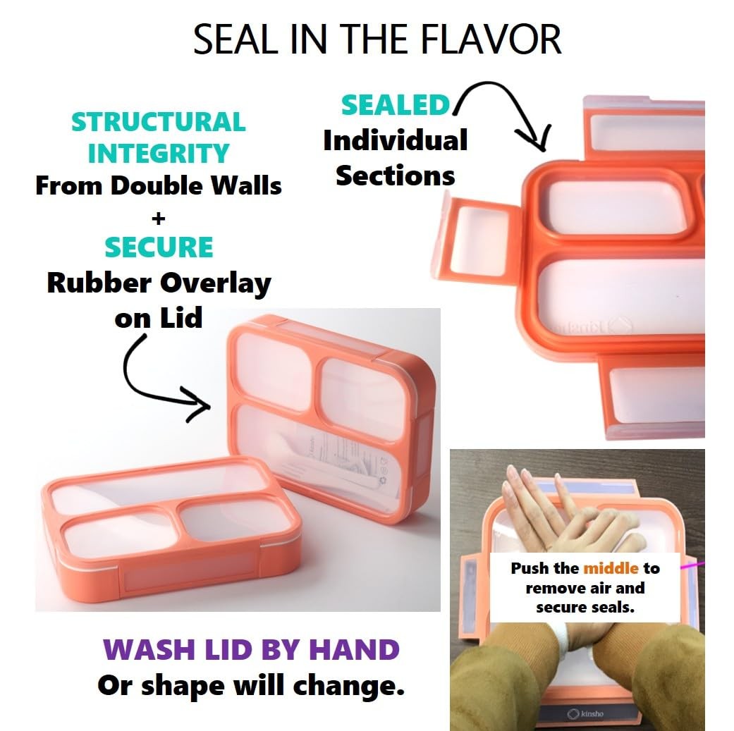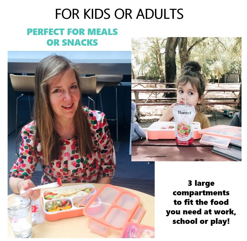 BENTO BOXES FOR FUN, HEALTHY LUNCHES Leakproof, Portioned Bento Boxes for Fresh Meals at Work, School or On the Go. Its Lunch Time, Enjoy and Have Fun! - Do you want a secure lunch container that has enough room for a variety of healthy and tasty foods and snacks? - Do you dislike messing with typical bento boxes that get all the food mixed together or small single container sizes that still leave you (or your kids) hungry? - Are you looking for a colorful, sturdy, eco-friendly lunch container that makes you smile? Introducing Bento Boxes with 5 Compartments! Durable, modern design. bento boxes provides maximum ease of use for satisfying lunches. Leakproof sections and double walled construction. Sturdy yet lightweight with a smooth finish and secure grip silicone overlay on the lid. Fork and spoon included. Holds over 4 cups in 5 compartments for a healthy variety of food. See picture with measures. NOTE: We recommend HAND-WASHING OF LID to maintain shape of leakproof seals and top shelf of dishwasher for bottom. BPA free. Microwave and freezer safe. SEALS are TIGHT and best for older kids or young adults. 100% Guaranteed to please! Amazon buyers trust our brand for quality, durable products. This will be one of your favorite lunchtime purchases! DELUXE LUNCHBOXES: Elevate lunches and snacks with thIs bento box set. Secure yet lightweight, create easy lunchable style meals for school, work or daycare, travel in the car and on the beach - whenever hunger strikes! Great for all age groups, seals are tight and toddlers will need assistance. 5 compartments, holds just over 4 CUPS, includes custom fit spoon and fork utensils. 9" x 6.75" x 1.75. BEST VALUE CHOICE - Recognized as the "Best Value" bento by SheKnows Media! Feel assured that you're offering a satisfying selection of healthy food for meals on the go. Individually sealed compartments maintain food freshness. Smile as compliments roll in about the appealing look of satisfying snacks or lunches in this sleek, modern design. SATISFYING PORTIONS: Our multi-compartment bento boxes empower you to gauge the portions you serve or consume, catering to individual appetites. Divided compartments vary in size, allowing you to choose portions for different items. Eliminate the need for pricey single-serve products with wasteful packaging. Easily portion out your desired amounts from value-sized packages, saving money and reducing waste. DURABLE + ECO-FRIENDLY: Crafted from BPA-free plastic, these reusable containers have extra-strong double-wall construction for enhanced durability. The easy-grip silicone overlay on the lid makes the box more secure to carry. Four secure snap-tight latches make the boxes drop-proof. These sturdy, eco-conscious containers are ideal for reducing waste while enjoying reliable, a high-quality food storage solution. CARE + USE: The seal is designed to be very TIGHT. Each compartment is individually sealed but is not appropriate for liquid, soup, etc. Safety tested for age 3+ but young children will need assistance with the lid. To support the longevity of your bento lunch-box set you must WASH LID BY HAND. The bottom tray is top shelf dishwasher and microwave safe. WHAT YOU GET: *Authentic bento. *Spoon & fork. *Tips + Eats eBook with 60+ Bento tips + recipes from ’s founder (a mom & award-winning mindful cooking author). *Industry leading guarantee. *Customer support from our US-based team.
