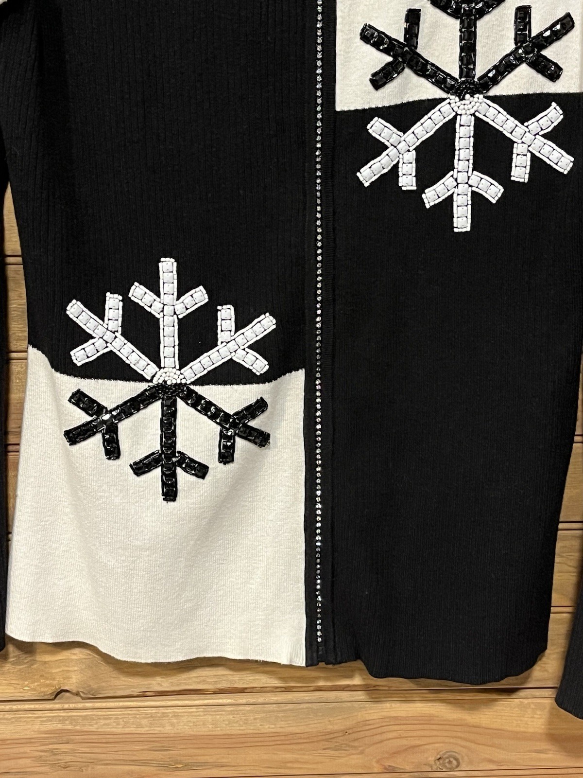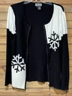 Berek 2 Women’s Black White Color Block Zip Sweater Beaded Rhinestones Size M Pre-loved in great condition. Rhinestone embellished zippers down front and on sleeve cuffs add twinkle and shine, while the front beaded snowflakes have eye catching appeal. Form fitting, can be worn either zipped or unzipped. Black and white color block front, long sleeves and solid black back. Perfect for the office, cocktails, travel or business. Please view all photos. Thanks for looking! PTP - 18”, length - 26”, sleeve length - 24”