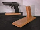 Cherry Pistol Stand specially made for Beretta M9 Family 9mm Double Stacked Why are my stands better? All Display Stands are made with the finest quality hand selected American Cherry clear heart wood cut and milled in the Shenandoah Valley of Virginia I work hard to get the barrels horizontal so every piece in your collection looks great when displayed together. Every piece is completely hand crafted in the USA. The Cherry is not stained to preserve the natural color. Five coats of durable polyurethane clear coat create a water free barrier to protect your piece. Felt feet protect your furniture. Serving collectors like yourself since 1996. Usually I get your order out within a few days, but if I am out of stock, I have to build the stand and that usually takes 1 to 2 week. Model with magazine slot:: 2.75 x 10.25 x 3/4 inches. Model without magazine slot: 2.75 x 7.25 x 3/4 inches Height: 5 inches We also do custom stands PISTOL NOT INCLUDED.