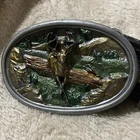 This is a vintage Bergamot Brass Works belt buckle made in 1983. The buckle features a pewter deer theme with enamel accents. This belt buckle is a great addition to any collection and is perfect for men who love hunting or the outdoors. Along with the buckle is a size 42 vintage hand tooled genuine full grain leather black belt in like new condition. Made in USA. No stress to any of the buckle holes. Excellent vintage condition.
