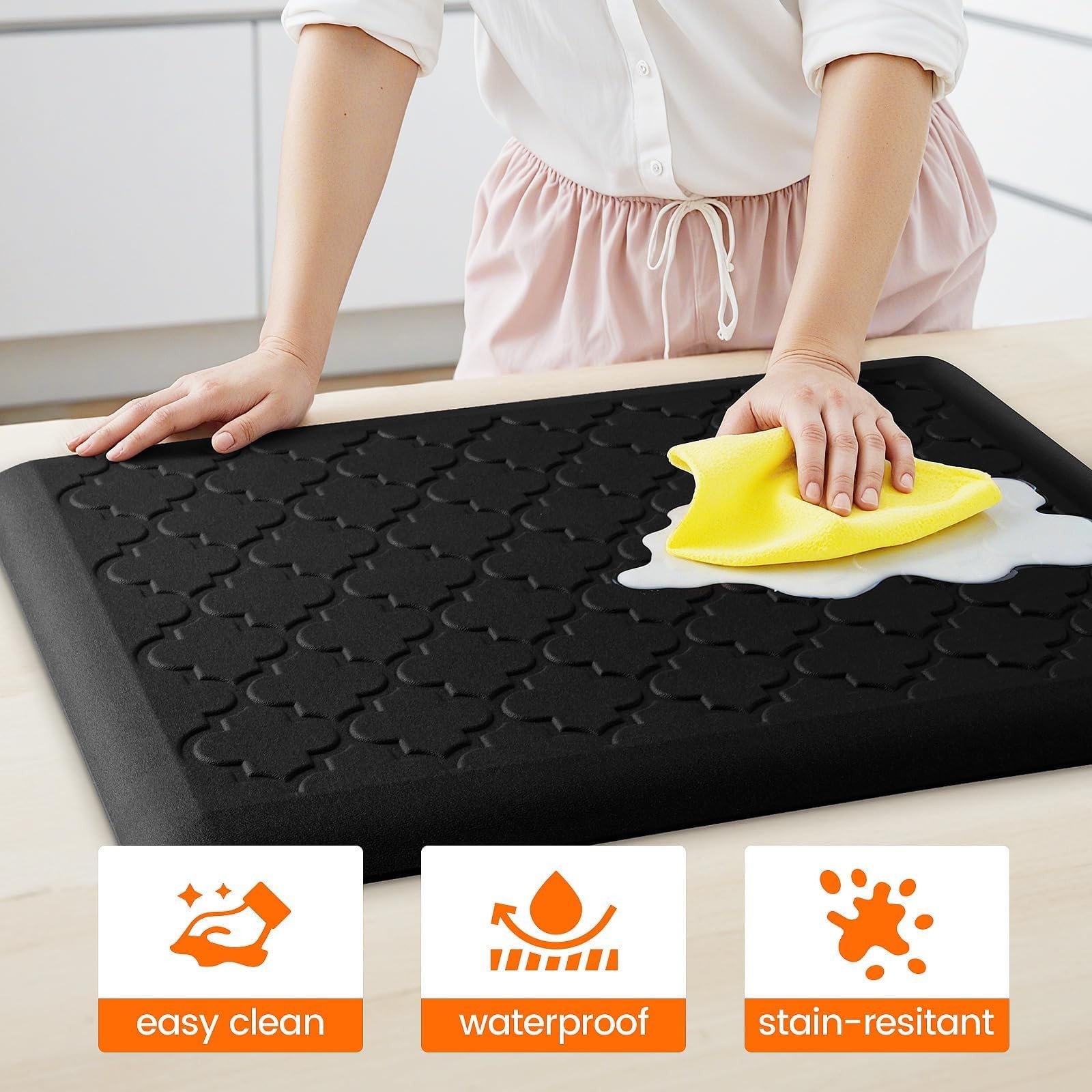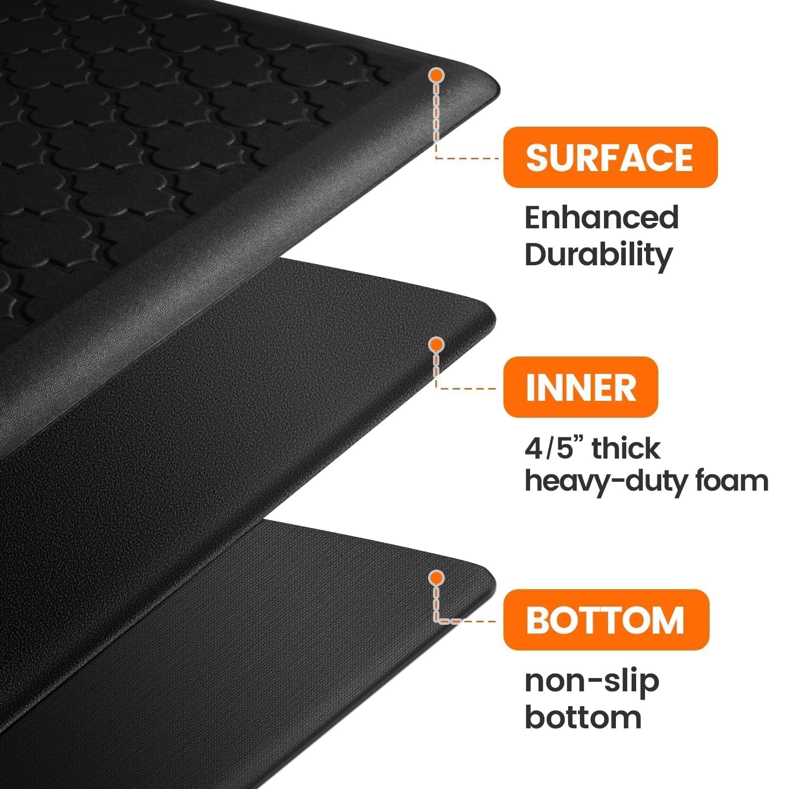 4/5 inch Extra Thick: The anti-fatigue mat is made of 4/5-inch extra-thick memory foam that provides supportive cushioning to reduce fatigue and enable you to stand comfortably for extended periods SAFETY DESIGN: Our kitchen floor mat is designed with a non-skid bottom and beveled edge to ensure safety, keeping the mat securely in place and preventing tripping, which helps keep your family secure Stain Resistant and Waterproof: The surface of our kitchen mats is waterproof and stain-resistant, ensuring easy cleaning. Simply wipe away water, oil, or sauce with a damp cloth, and the mat remains clean with no stain residue VERSATILITY: Neutral tones match any décor and are perfect for any area of your home, like the kitchen, office, workstation, and more Use Instructions: If the mat is wrinkled upon receipt, lay it flat and blow warm air using a hair dryer 1 inch away. Alternatively, you can leave it in the sun for 2-4 hours. This will quickly remove any folds and restore its shape 4/5 inch Extra Thick: The anti-fatigue mat is made of 4/5-inch extra-thick memory foam that provides supportive cushioning to reduce fatigue and enable you to stand comfortably for extended periods SAFETY DESIGN: Our kitchen floor mat is designed with a non-skid bottom and beveled edge to ensure safety, keeping the mat securely in place and preventing tripping, which helps keep your family secure Stain Resistant and Waterproof: The surface of our kitchen mats is waterproof and stain-resistant, ensuring easy cleaning. Simply wipe away water, oil, or sauce with a damp cloth, and the mat remains clean with no stain residue VERSATILITY: Neutral tones match any décor and are perfect for any area of your home, like the kitchen, office, workstation, and more Use Instructions: If the mat is wrinkled upon receipt, lay it flat and blow warm air using a hair dryer 1 inch away. Alternatively, you can leave it in the sun for 2-4 hours. This will quickly remove any folds and restore its shape