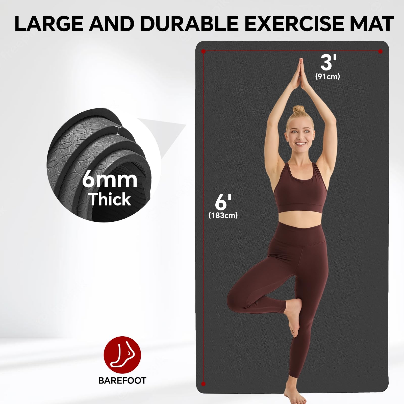 Our thick workout mat is designed to enhance your yoga experience. with features of gym mats for home gym, exercise mat thick is for practitioners of all levels. 3-layer Design: Our exercise mats for home workout features a 3-layer system that ensures optimal performance. The wear-resistant top of floor mats for gym guarantees longevity. The shock absorption mid-layer of gym floor mats minimizes joint impact. The anti-slip bottom of thick exercise mats for home workout ensures stability. Meet Various Needs: Our gym flooring for home gym is designed to cater to various fitness needs. Gym floor mat is suitable for barefoot training and can adapt to different yoga styles. Double-sided Anti-slip Texture: The non-slip texture of workout floor mats for home gym firmly grips the floor, offering traction and preventing slips. 2 Sizes Available: Our gym matt for home gym comes in two size options, ensuring ample room for various fitness activities. We have the size to accommodate your needs on exercise mats for home gym. 【Spacious & Designed for Movement】 large yoga mats come in large dimensions: 6'×3', 6'×4', providing up to 120% more space than standard yoga mats. Suitable for various barefoot exercises such as yoga, Pilates, stretching, meditation, planks, push-ups, squats, and cardio workouts