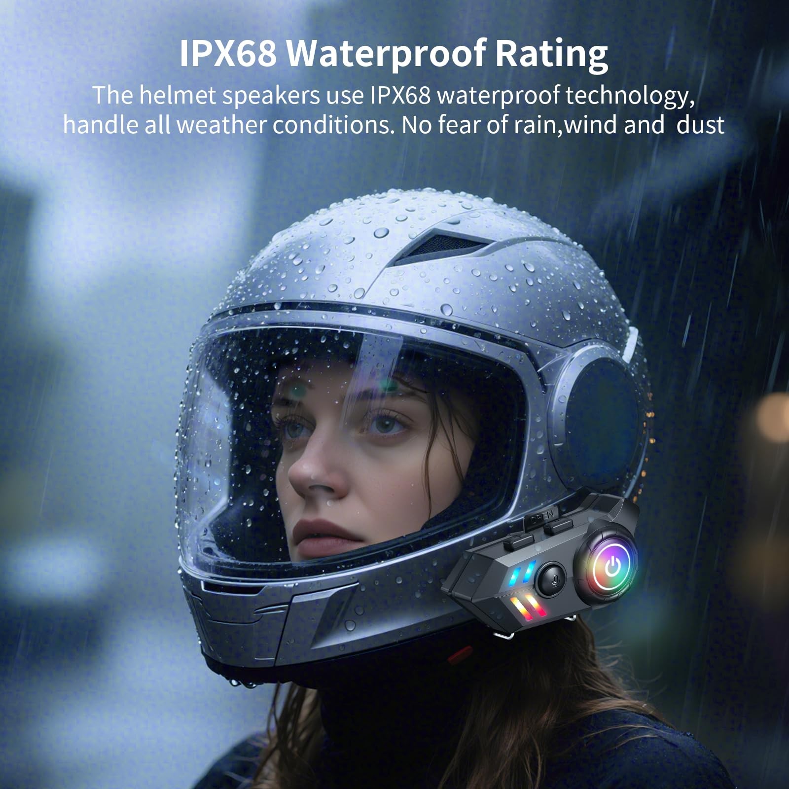 motorcycle bluetooth speakers with Loud and Clear Stereo,Whether cruising on the highway or exploring backroads, enjoy your favorite music, GPS navigation, and hands-free calls with clarity and precision. [Bluetooth 5.3 Quick and Stable Connect] motorcycle bluetooth headset use the latest Bluetooth 5.3 chip is anti-interference and more stable, letting you fast connect Bluetooth devices. It has an automatic memory function, which can automatically reconnect to the last used device and can connect two phones at the same time. You can enjoy music while listening to GPS voice guidance, which makes for safe and happy riding [Auto Answer and Voice Control] The motorcycle helmet bluetooth speakers can automatically answer calls in 10 seconds for hands-free communication. With this feature, you can answer calls without having to take your hands off the handlebars or fumble for your , which is safer and more convenient. Simply pressing helmet headset voice control button, you can easily summon your voice assistant or Siri to perform a variety of tasks without taking your focus off the road [Loud and Clear Stereo & Double Noise Cancellation] The unique construction of the 40mm graphene diaphragm ensures the excellent sound quality for music and calls. By utilizing triple noise reduction technology including DSP/CVC/built-in microphone. The motorcycle helmet speakers effectively eliminates environmental noise, ensuring that your voice is heard clearly by the other party, resulting in a purer and clearer sound, even at high speeds [Enhanced IP68 Waterproof] The bluetooth motorcycle headset incorporates advanced nano-coating technology and has IP68 waterproof and dustproof resistance, making it completely resistant to rain, wind, or dust, conquer any weather conditions with confidence and peace of mind and enjoy the music even in the rain riding. A motorcycle accessories that is worth having [1000mAh Large Battery & TYPE-C fast charging] 1000mAh powerful battery life of this helmet bluetooth headset offer up to 30 hours of music playback, 28 hours of talk time, and 100 hours of standby, enjoy uninterrupted use all day. The bluetooth for motorcycle helmet supports TYPE-C fast charging, just charge for 2 hours, Support to display battery on mobile [Gloves-Friendly Large Button & Easy Installation] helmet headset is large button design, easy to press, lets you control your headset effortlessly, even while wearing thick riding gloves. Helmet speaker fits perfectly onto the helmet, providing a feather-like lightness and virtually no burden, giving you a seamless riding experience without any constraints. Easy to install, requiring no additional tools, effortlessly attaches to the helmet and secure, allowing you to stay focused on your ride. helmet speakers are compatible with most types of helmets. Work Seamlessly with Motorcycle/ Snowmobiles/ ATVs/ Dirt Bike Helmets