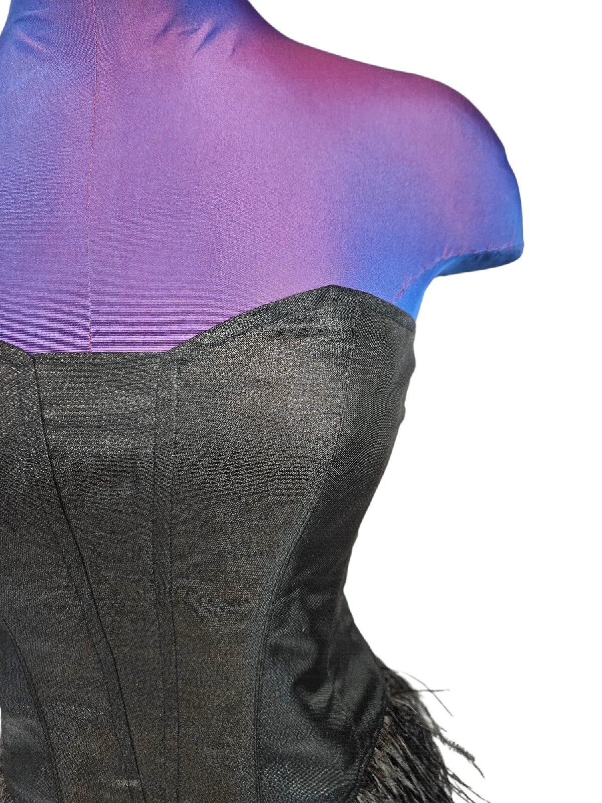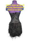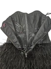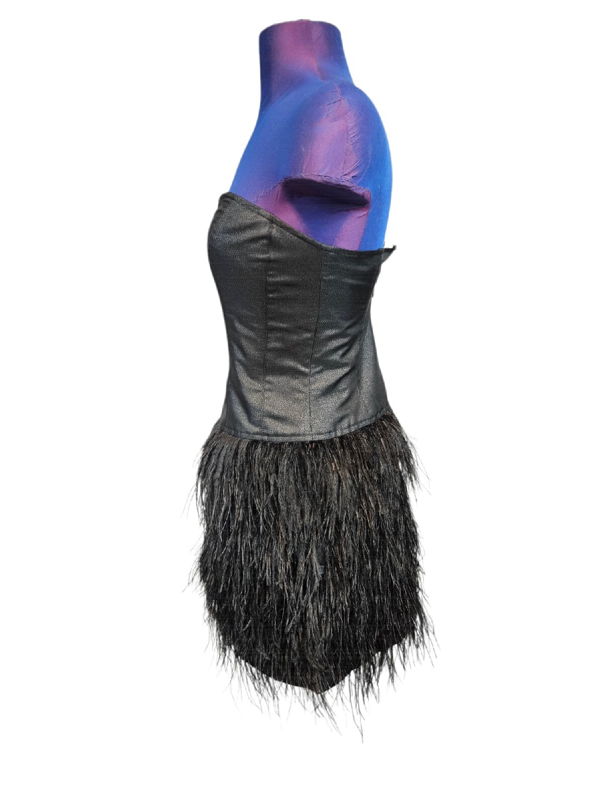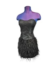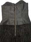 Betsey Johnson Black Faux Leather Ostrich Feather Strapless Dress Size 0 Women's. In like new condition Betsey Johnson Black Faux Leather Ostrich Feather Strapless Dress Size 0 Women's. Features sexy and chic black faux leather strapless corset dress with ostrich feather skirt, corset faux leather has a light silver sparkle, boned top, layered ostrich feather skirt, fully lined. This cocktail dress is sure to turn heads! Measurements laying flat chest 15" waist 13" length 25" to dress hem Fabric polyester and ostrich feathers This is a pre-owned item that may show signs of wear. In like new condition, no flaws.