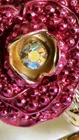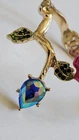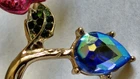 Betsy Johnson Gold Tone Fuschia Rose Flower Hinged Bypass Bangle. Polished gold tone bypass hinge bangle features textured detailing to look like a rose branch. One side of bangle features a large fuchsia layered rose with fuchsia stud detailing on rose, center of rose with round iridescent crystal accent. Other side of the bangle features a gold tone & blue teardrop shaped crystal accent. Also on bangle 2 leaf accents on each side with light green & dark green crystal accents. Betsey Johnson stamped inside bangle. Pre-owned. Some wear and scratches to crystal. See photos.