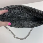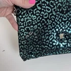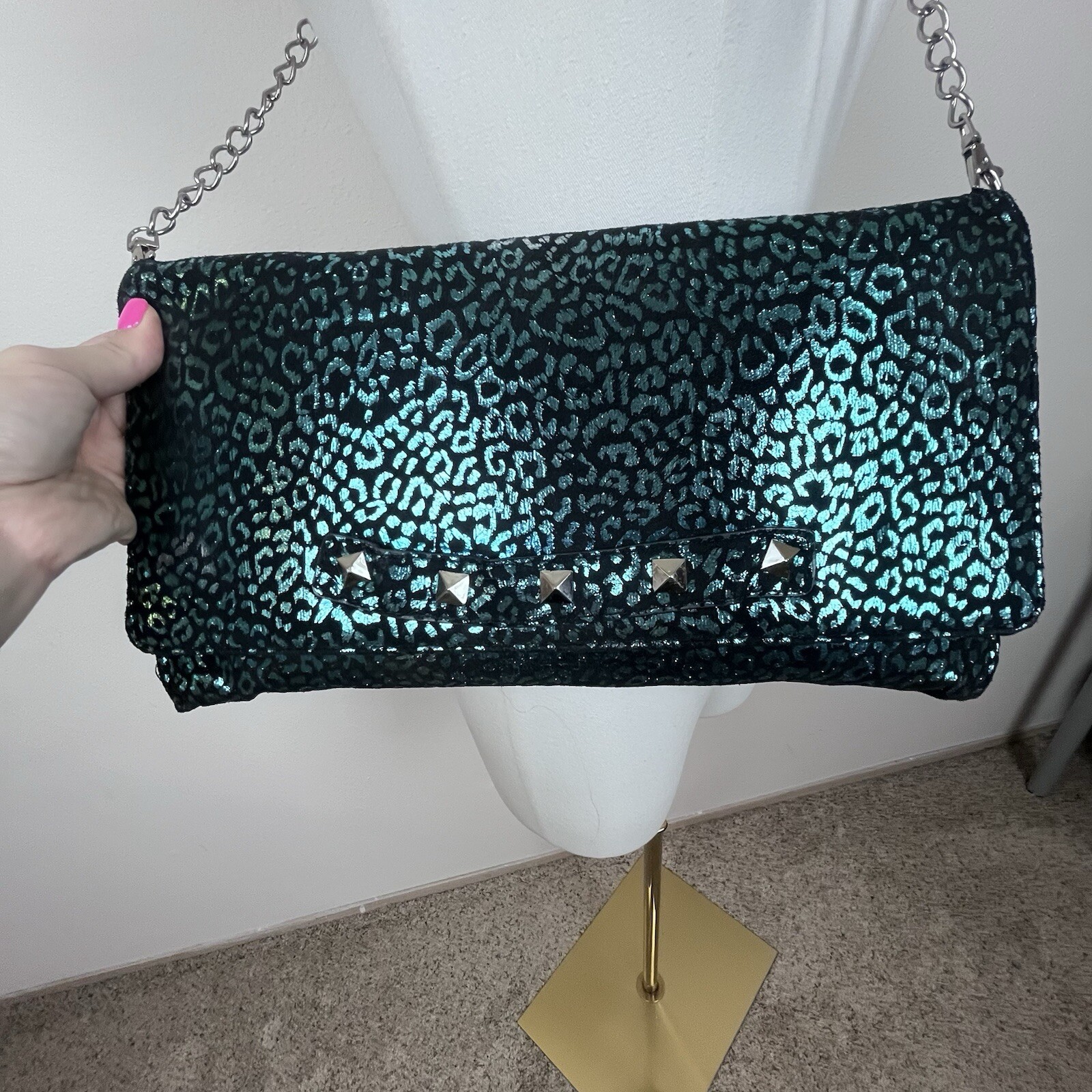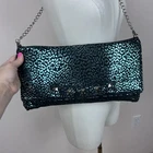 Betsey Johnson Womens Purse Fabric outer shell Detachable chain strap Studded accents Oversized clutch Shoulder bag Envelope clutch Snap closure Animal print Metallic Leopard Cheetah Grunge Punk Goth Measurements in photos One Size