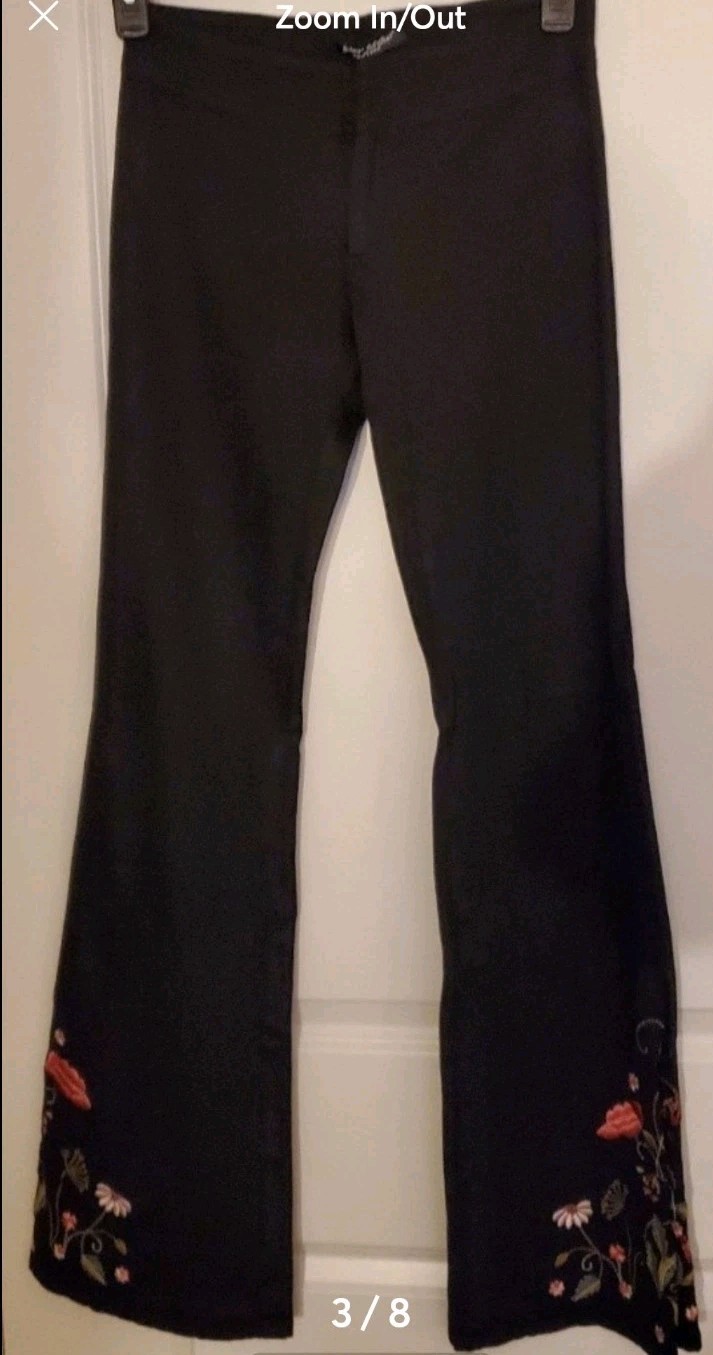 These Betsey Johnson NY Size 8 Floral Embroidery Black Flare Pants in Stretch are perfect for a dressy occasion in the spring season. The pants feature a flat front, flared leg style, and are designed for regular sizing. The black color and floral embroidery add a touch of femininity to the dress pants, making them a stylish addition to any woman's wardrobe.