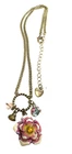 This Betsey Johnson necklace features a tropical flower charm in pink and orange enamel on a goldtone 18" chain. The pendant shape is a flower, accented with crystal secondary stones in a pavé setting. The necklace is signed by Betsey Johnson and is a charming piece perfect for occasions like Mother's Day, Christmas, or a walk in the park. It exudes a fun and vibrant vibe with its nature-themed design, making it a great accessory for adding a touch of beauty to any outfit.