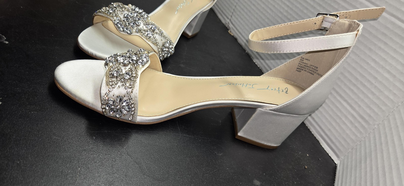Brand: Betsey Johnson Style: Womens open-toe heeled sandals with ankle strap; rhinestone and faux pearl embellished front strap on satin-look ivory upper. Color: Ivory with signature light blue outsole (bridal "something blue" detail). Size on tag: 8M (Womens). Style/Model code printed inside: SB-MEL; additional code: 1422. Materials (per tag): Fabric upper, PU lining/sock, fabric coated outsole. Made in China. Details: Block heel, buckle closure ankle strap, cushioned footbed, dressy bridal/occasion style. UPC: 940689997618