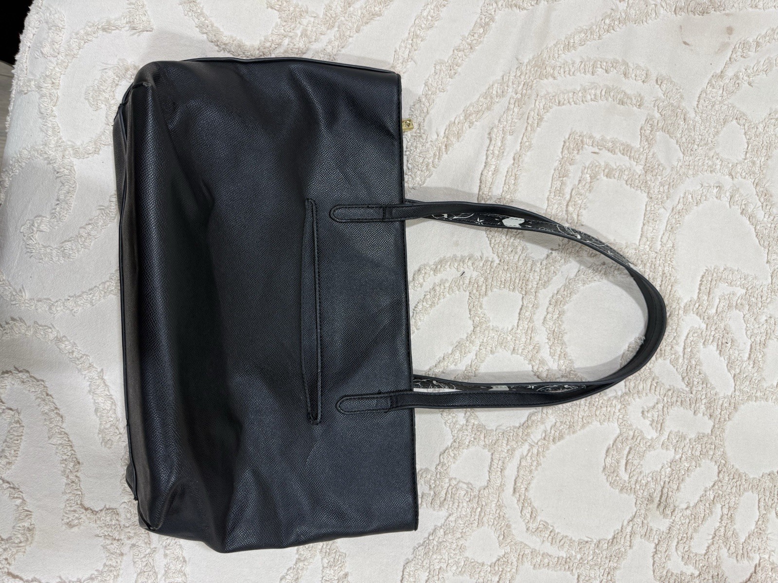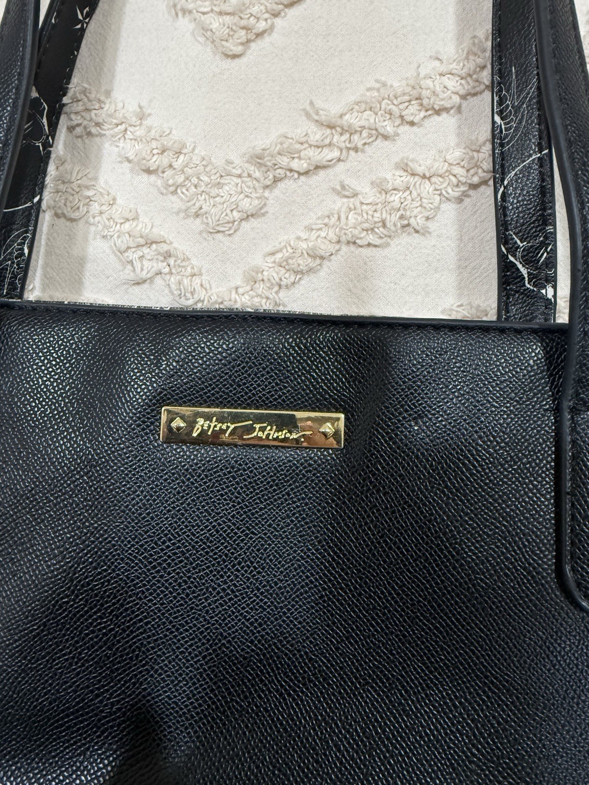 Black leather collectible, Betsey Johnson, vintage shoulder bag, handbag tote bag with floral lining and gold hardware, has regular signs of wear
