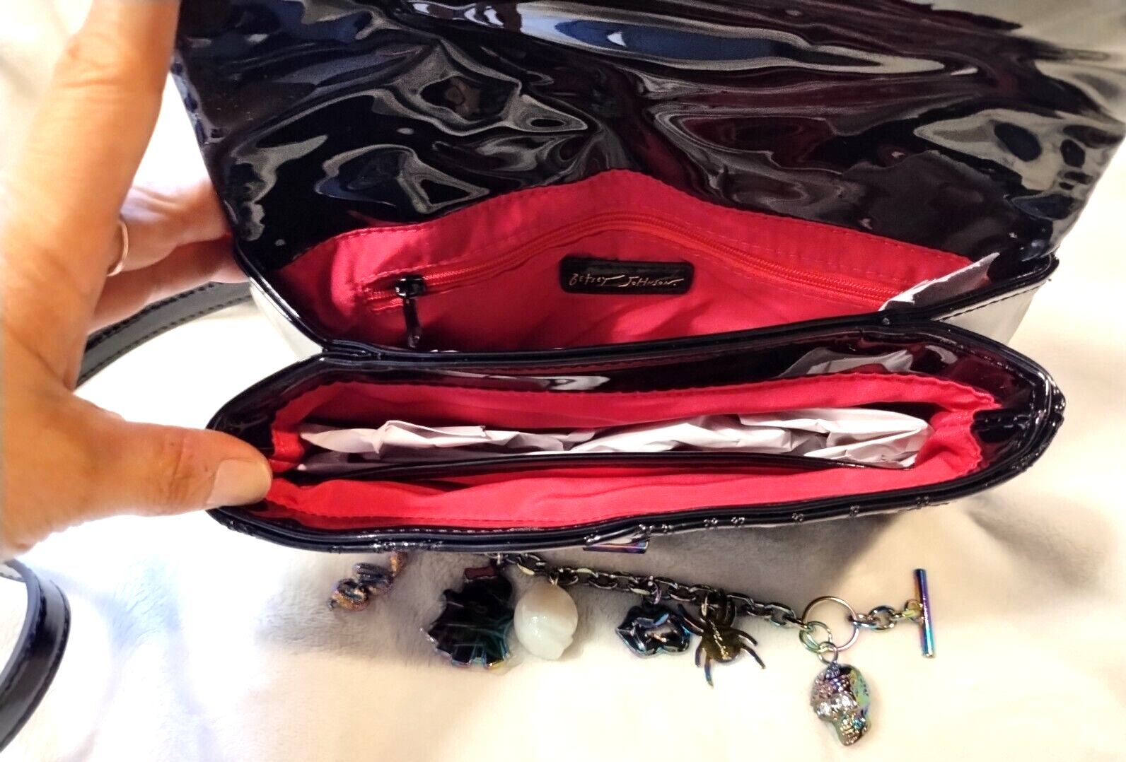 New without tags Betsey Johnson crossbody. Come with a detachable charm bracelet and strap. The hardware and accents are "oil slick" color. The front has spider and stud accents, and the Betsey Johnson signature on back. Discontinued in the U.S.