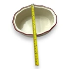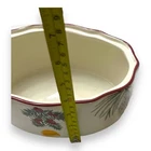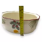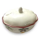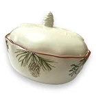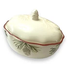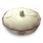This oval-shaped covered dish from Better Homes & Gardens is the perfect addition to your holiday dinnerware collection. Featuring a festive PINECONE pattern in multicolor, this 2 qt dish is made of durable stoneware material. Ideal for serving your favorite dishes during the Christmas season, this dish is part of the Better Homes and Gardens product line. This product has a sticker on it that says Limited Edition and is part of the Heritage Collection. Size 9.5 x 7" in length and width. The depth is 9" deep. This is a beautiful covered casserole dish.