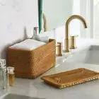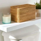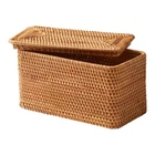 The Better Homes & Gardens Rattan Organizer Basket with Lid in Brown is a cube storage solution made of durable rattan material. It has assembled dimensions of 11 x 6 x 6 inches and features a lid for added convenience. This garden-themed basket is ideal for organizing bathroom accessories and other items in your home.