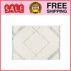 Rectangular ivory and beige indoor rug Offers a subtle yet stylish geometric print with a textured design Available in this 5' x 7' size or in your choice of a 21" x 84", 8' x 10', or 30" x 46" size Made from tufted cotton Caring for your rug is simple with quick spot cleaning Shedding of loose fibers is normal. We recommend vacuuming the rug regularly on a low-power setting with a beater brush