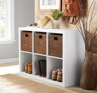 Add function and style to your home with the Better Homes & Gardens 6-Cube Storage Organizer. Available in multiple finishes, including both solid and wood grain options, this cube organizer features six 13" x 15" x 13" compartments, the perfect size to display books, collectibles, photos, artwork, storage bins and baskets. An open back design makes it easy to manage cords and cables. This sturdy bookcase can stand vertically or horizontally to best suit your needs and space. The top panel supports up to 100 lbs and each cube supports up to 51 lbs. Combine it with other Better Homes & Gardens Cube Organizers and Cube Storage Bins (sold separately) to create a complete, customized storage and display system. Easy to assemble with included wall attachment system, the Better Homes & Gardens 6-Cube Storage Organizer is perfect for your office, living room, den, playroom and more. Modern, open back design for easy cord management Features six 13" x 15" x 13" compartments Compatible with Better Homes & Gardens Cube Storage Bins (sold separately) Versatile design allows for vertical or horizontal placement Top panel can support up to 100 lbs, each cube supports up to 51 lbs Can be combined with other Better Homes & Gardens Cube Storage Organizers (sold separately) Materials: MDF, particle board, paperboard and iron Attaches to the wall with included safety strap Easy to assemble with included instructions (hammer & Phillips head screwdriver required) Finishes available: White Texture (BHD036118664020), Tobacco Oak (BHD036118664021), Natural (BHD036118664022), Rustic Gray (BHD036118664019), Solid Black (BHD036118664017) and Gray (BHD036118664018) Package size: 44.49" x 9.25" x 18.11" (53.17 lbs) Assembled weight: 44.88 lbs Assembled dimensions: 30.16" W x 15.35" D x 43.35" H For customer support or assembly assistance, visit or call 1-800-729-1569.