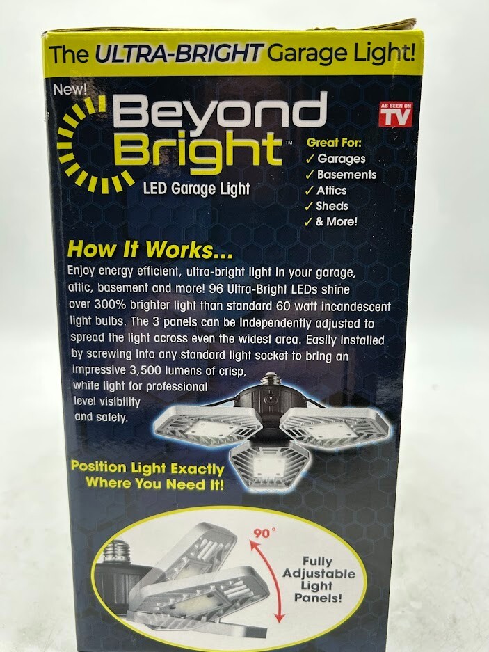 This is a NEW OPEN BOX item. The item is new, unused. Listed as open box due to the fact there is some packaging distress. Say goodbye to dimly lit spaces with the BEYOND BRIGHT Ultra-Bright LED Light , designed to provide 300% more brightness than a standard 60W bulb. Featuring 96 ultra-bright LEDs and 3 adjustable panels , this 3,500-lumen powerhouse ensures clear, evenly distributed light in garages, basements, attics, workshops, and more . Installation is effortless— just screw it into any standard light socket , no tools or wiring required! Key Features: Ultra-Bright Output: Produces 3,500 lumens of pure white light— three times brighter than a standard 60W bulb. Hassle-Free Installation: No wiring or tools needed— simply screw it into a standard light socket . Adjustable Panels: Three multi-directional LED panels let you direct light exactly where you need it most. Energy Efficient: Uses just 40 watts , helping you save on energy costs while maximizing brightness. Versatile Use: Ideal for garages, basements, attics, sheds, workshops, utility rooms, and more . Upgrade your lighting with BEYOND BRIGHT —for a brighter, safer, and more efficient workspace ! We take great care to inspect all items and ensure they are accurately described. Should you have any issues with your purchase, please let us know immediately. We are committed to resolving any concerns promptly and to your satisfaction. Our small business truly appreciates your patronage.