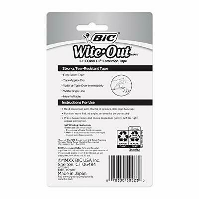 Bic Wite Out Correction Tape, 1 Tape Description: Applies dry, write over instantly Tear-resistant, film-based tape Fast, clean and easy to use Translucent body provides visible tape supply Covers photocopies, faxes, ink, permanent marker and more EZ Correct Correction Tape 1pk Shipping We offer FREE shipping on all orders! We ship within Three business days of payment, usually sooner. We use a selection of shipping services such as UPS, FedEx, USPS etc. We only ship to the lower 48 states, no APO/FPO addresses or PO Boxes allowed. Local pickups and combined shipping options are not provided at this time. Return You can return a product for up to 30 days from the date you purchased it. Any product you return must be in the same condition you received it and in the original packaging. Please keep the receipt. Payment We accept payment by any of the following methods: PayPal Please pay as soon as possible after winning an auction, as that will allow us to post your item to you sooner! Feedback Customer satisfaction is very important to us. If you have any problem with your order, please contact us and we will do our best to make you satisfied. Contact Us If you have any queries, please contact us via ebay. We usually respond within 24 hours on weekdays. Please visit our eBay store to check out other items for sale! Thank you for shopping at our store.