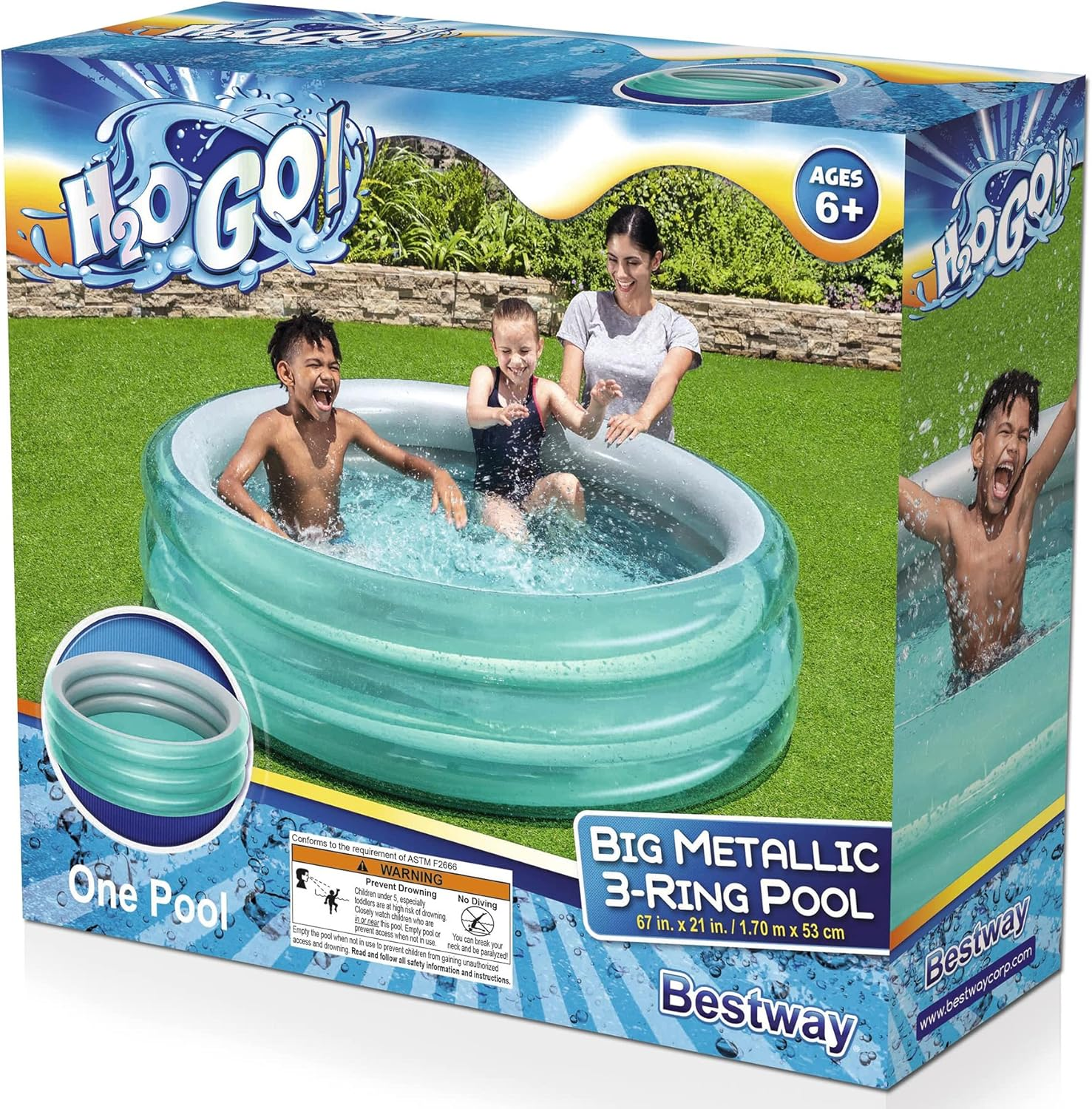 Big Metallic 3-Ring Inflatable Play Pool (5’7” Diameter) Perfect for kids, ages 6+. Quick and easy setup. Water Capacity: 184 gal. (697 L). Contents: 1 play pool, 1 repair patch. Size: 5 ft. 7 in. x 21 in. (1.70 m x 53 cm). The H2OGO! Big Metallic 3-Ring Pool is the perfect size for families with children, providing a suitable depth for kids to splash around and play in. The practical size also ensures those with small backyard spaces can enjoy water fun in the summer sun. The pool has transparent green sides with a reflective metallic liner for an ultra-cool look in your backyard. It easily inflates so kids can begin their swimming adventure in no time! Bestway kiddie pools makes it possible for kids to take a refreshing dip in the pool right in their own backyard. Following the latest fashions and trends, these inflatable pools are fun and offer kids hours of endless summer fun. Easy to inflate, deflate and store, kiddie pools are a conveniently simple option for families and a great way to introduce young ones to water. Item model number 51042E Product Dimensions 67"L x 67"W x 21"H Capacity 697 Gallons Assembly Required No Color Multicolor Special Feature Inflatable Material Plastic Country of Origin China Occupancy 3 person Item Weight 5.88 pounds Shape Round Manufacturer recommended age 6 years and up Age Range (Description) Kid Included Components toy Target Audience Unisex-Kids Release date December 30, 2021 67.0 "h x 67.0 "h x 21.0 "h. Weight: 5.88 lb Shipping from the USA All of our products are shipped from the USA, ensuring quick delivery to your destination. Payment We offer the following payment methods: PayPal, credit card, bank transfer, and eBay's secure payment system. Free Shipping & Free Returns Shipping within the USA is FREE. Additionally, any return is absolutely free for you. Risk-Free Purchase You have the option to return an item within 30 days without any justification. We cover the return shipping costs! Fast Shipping We ship immediately upon receipt of payment. Generally, the package is delivered within 2-3 days in the USA. If it takes longer, we will contact you. Quality and Costs Made in Europe, USA, China No customs fees or additional charges Total satisfaction guarantee Invoice with declared VAT available upon request in .pdf format Feedback Your feedback is very important to us. After you pay for your purchase, you will automatically receive positive feedback from us.