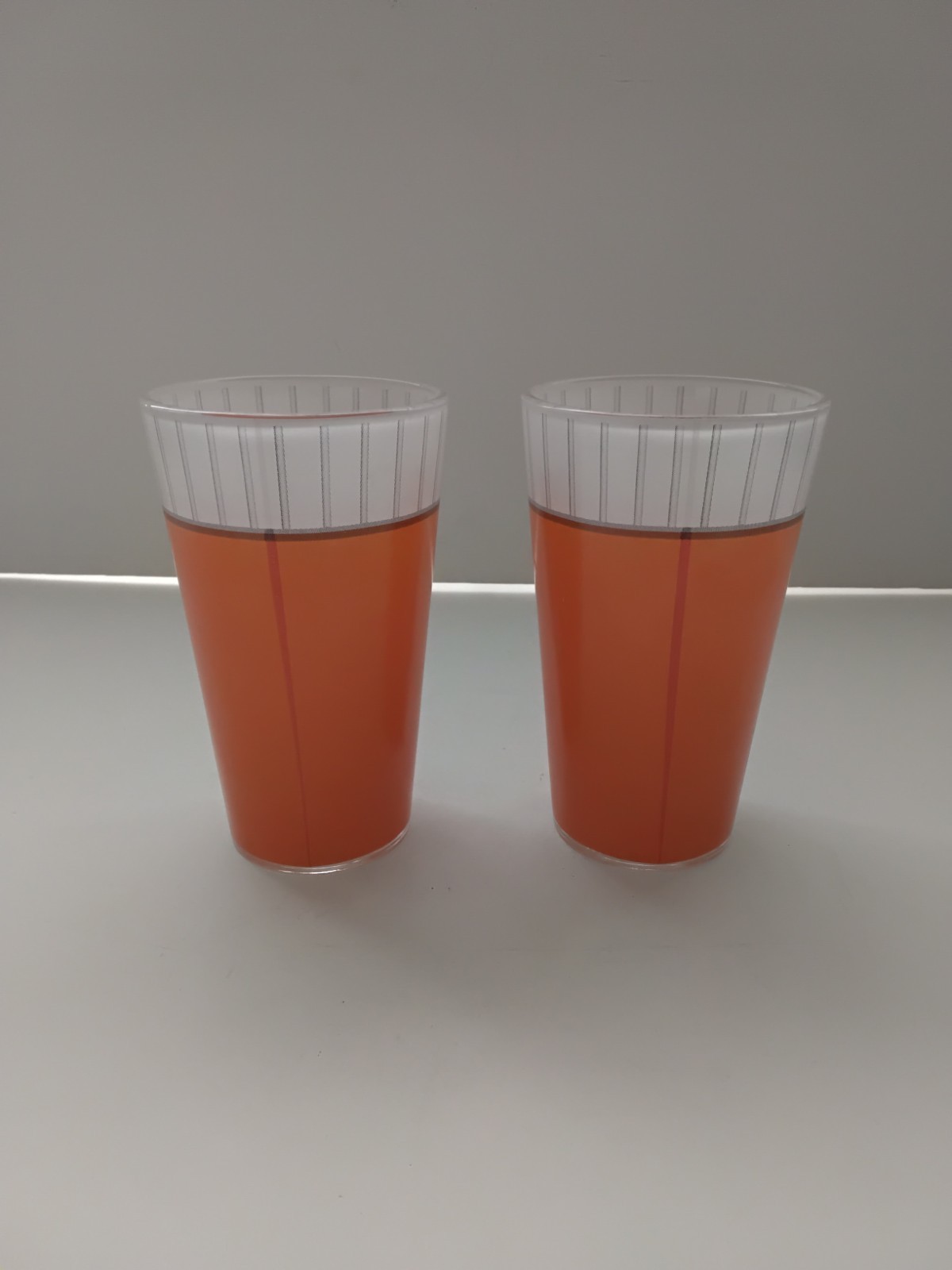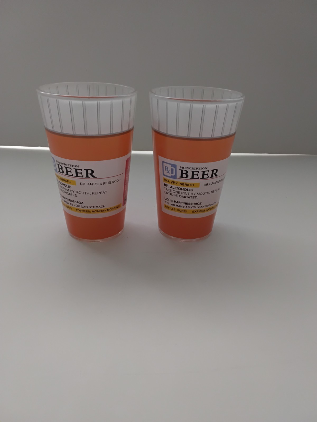 Set of 2 vintage novelty Prescription Rx Beer pint 16 oz drinking glasses by Big Mouth Toys. Orange color and made to look like prescription bottles. No nicks, cracks, or chips. Tags: gag gift comic funny humor man cave bar cart adult beverage glassware kitchen collection party drinkware barware