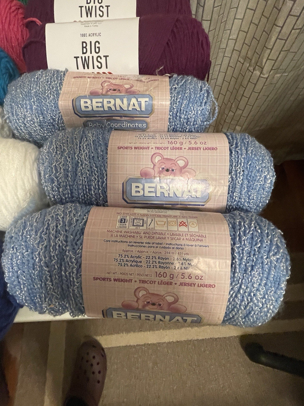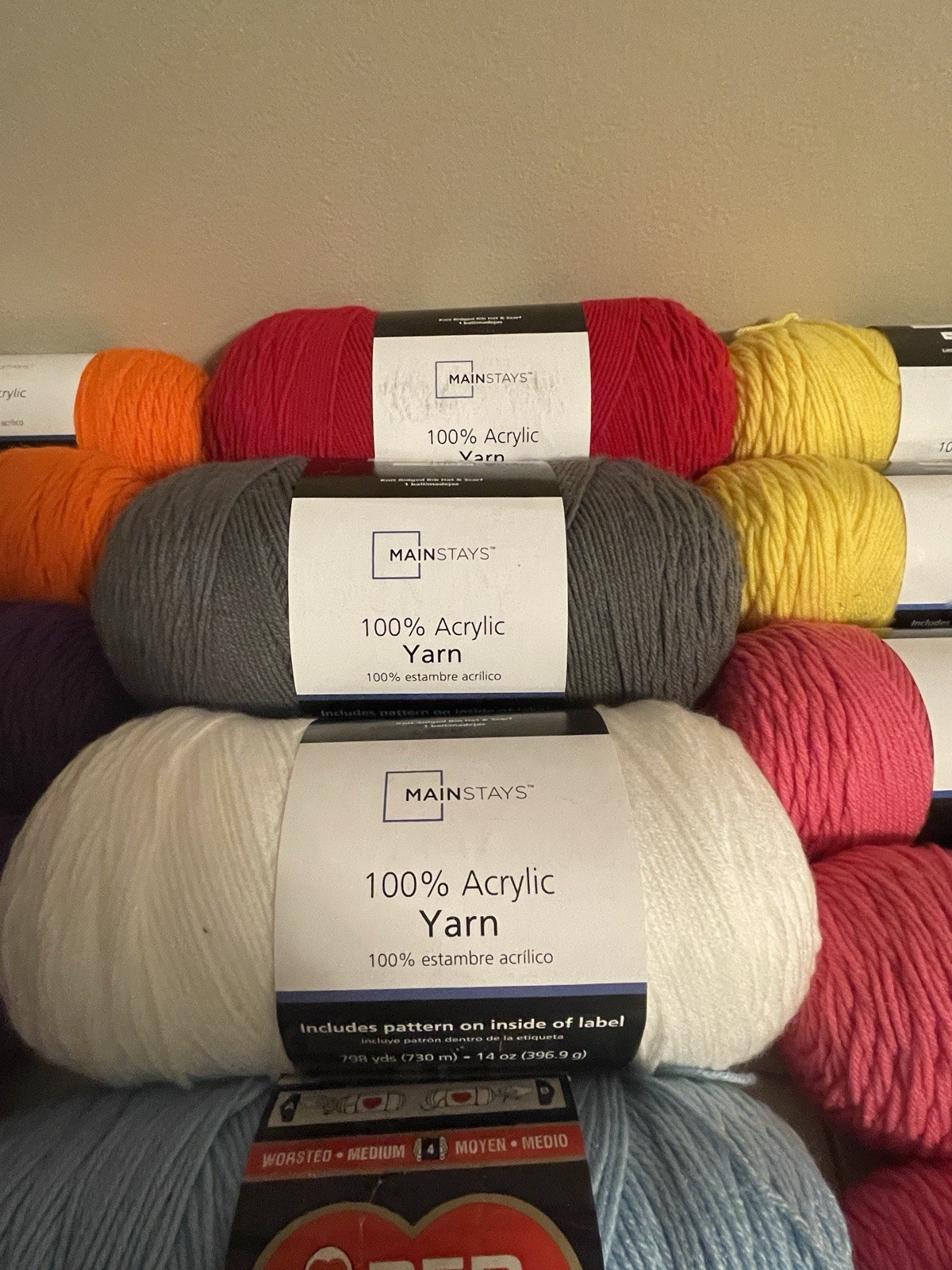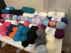 This bundle has a total of 34 new skeins. A breakdown of which 2 Red Heart brand, 3 Bernat, 8 Big Twist, 16 Mainstays (3 of those are jumbo size), and 5 unmarked because the label is missing. There is also a huge amount of yarn cakes that are made as well. The total weight of everything is 24lbs. This is being sold AS-IS. One white skein does have very light staining. See photos for details.