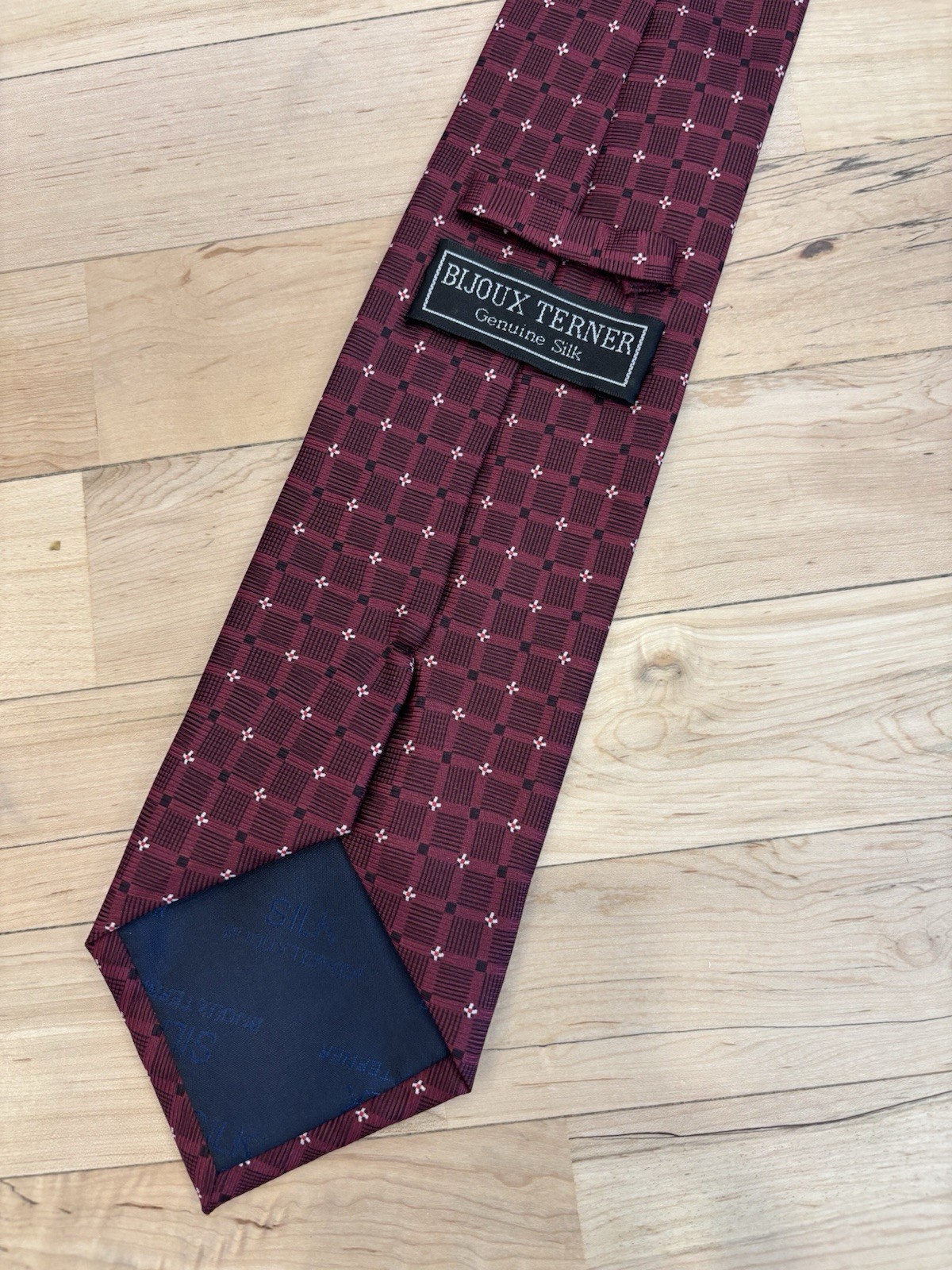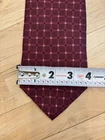 Beautiful burgundy maroon silk necktie with geometric pattern. Excellent condition, with no known flaws. 100% silk. 4” wide and approximately 56-58 inches long.