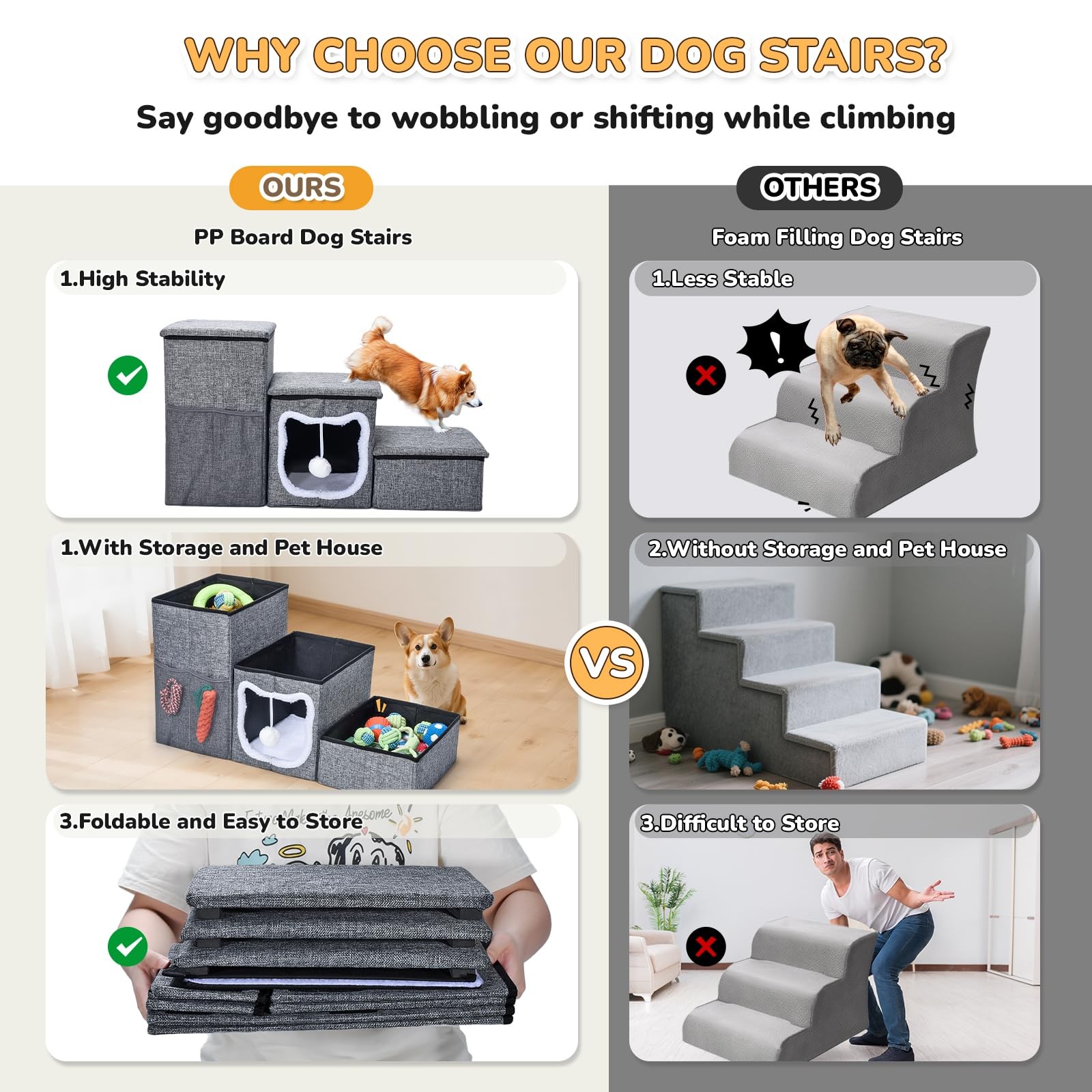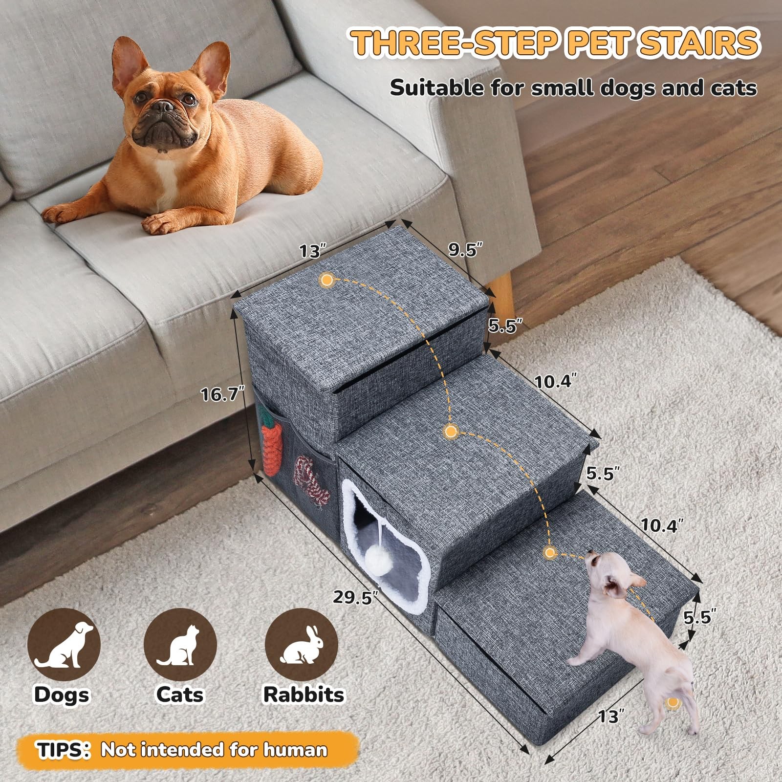 【3 Steps Dog Stairs】Our dog stairs are 29.5 x 16 x 13 inches. As we know, dogs aren't suited to jumping at heights very often, it's not good for their joints, these 3-step dog ramps are perfect for small medium dogs. The carefully sloped steps provide safe access to sofas, high beds, windows and cars. Tip: Not intended for human 【Dog Stairs for Small Dogs】This dog ramp is suitable for small dogs, such as 2–6 lbs Chihuahua 3–7 lbs Pomeranian 4–7 lbs Yorkshire Terrier 4–7 lbs Maltese 9–16 lbs Shih Tzu, 16–28 lbs Dachshund 12–25 lbs Boston Terrier 13–18 lbs Cavalier King Charles Spaniel 14–18 lbs Pug 【Cat Steps】If you have cats, this pet stairs is also suitable for cats. Place it on the sofa or windowsill so that they can walk up and down or look at the view outside, giving them more fun. 【3 Steps Dog Stairs】Our dog stairs are 29.5 x 16x 13 inches. As we know, dogs aren't suited to jumping at heights very often, it's not good for their joints, these 3-step dog ramps are perfect for small medium dogs. The carefully sloped steps provide safe access to sofas, high beds, windows and cars. Tip: Not intended for human 【Robust and Reliable Design】Crafted from medium-density fiberboard, our foldable dog stairs provide a stable platform that supports pets of all sizes. The sturdy construction ensures smooth and secure climbing, minimizing the risk of injuries. And The soft foam layer on each step absorbs impact and reduces pressure on pets' joints. Non-slip rubber dots on the bottom ensure stability. Includes a portable handle for easy transport and some Velcros for securing the steps 【Dog Steps with Storage】These pet stairs feature two storage boxes to organize toys and treats. The pet condo with a plush cushion for a sleeping area, and a fluffy ball at the entrance adds extra fun. The side pockets keep essentials within reach for quick access 【Easy to Set and Storage】These pet stairs for cat or small dog will take you literally just two minutes to put it together, and it's sturdy enough for your pets to jump up and down without wobbling. If you no longer need to use it, he can be folded up without taking up too much space 【Tailored for Pet Comfort】 Ideal for short-legged dogs, elderly pets, and those with mobility challenges. Use treats to encourage pet initial use. These dog steps are compact and easy to store, sturdy to eliminate the need for frequent replacements