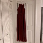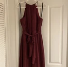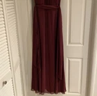 Bill Levkoff Style 1404 Wine Chiffon Keyhole A-Line Dress With Sash Tie (Size 8). Retail price: $200. I wore this chiffon dress once in a wedding and it has been freshly dry cleaned since. It has not been altered as I’m 5’10 and didn’t need to hem it so it’s able to be hemmed for your height. Size 8. Keyhole detail at the top with cups sewn inside so you don’t necessarily need a bra. Sash ties at the waist (can be turned around to tie where you’d like). I wore it tied in the back but you could do it off to the side in the front too. Very pretty Wine color, shade in the model photo is most true to what it looks like in person. Style #1404 from Bill Levkoff