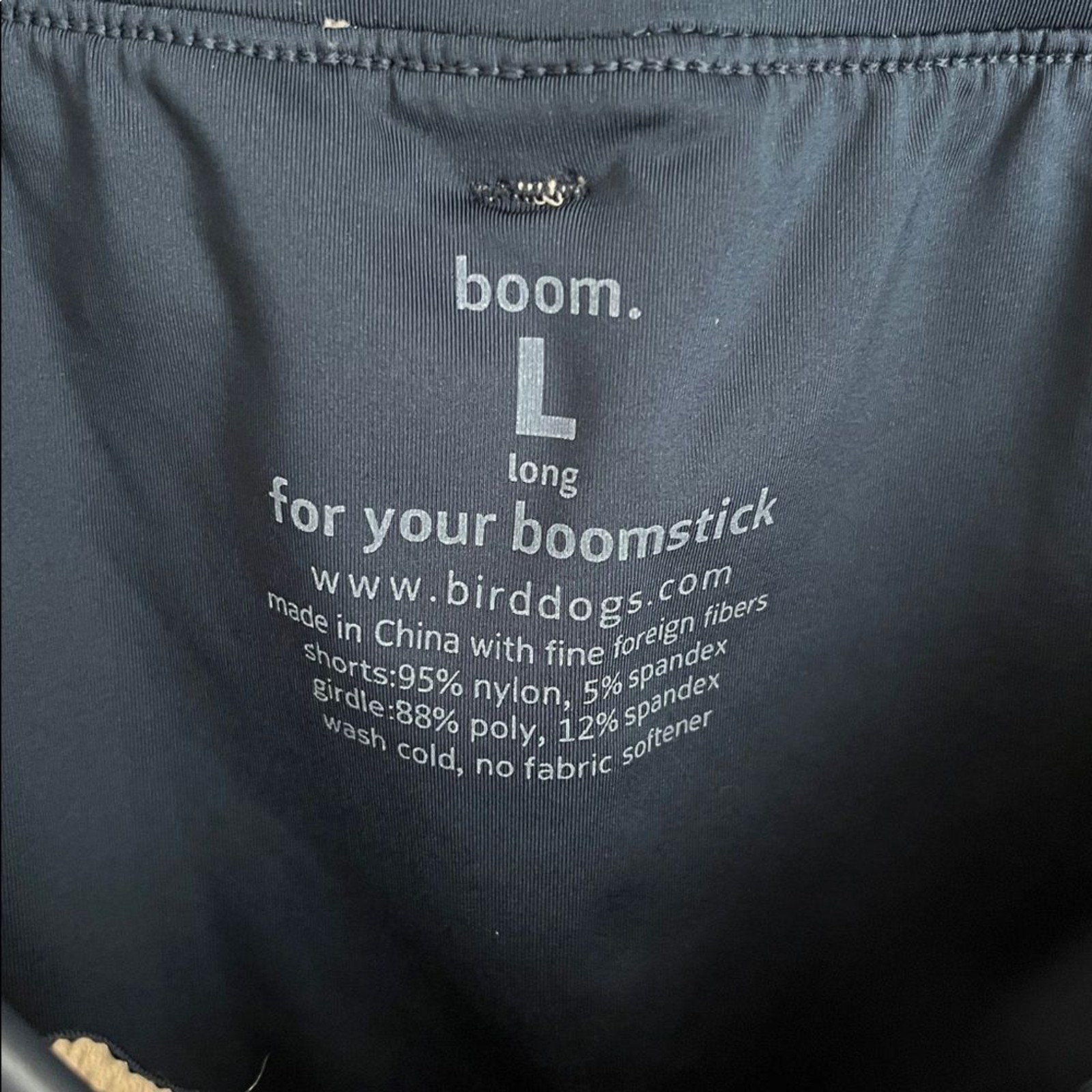 Bird Dogs Boom for Your Boomstick tan men’s shorts, Size L long. Pull-on style, undershorts, traditional and zip-closure pockets, adjustable tie waistband. Laying flat, in approximate inches: 15.5” across waistband 18.75” total length (outseam) 9” inseam 11.5” front rise