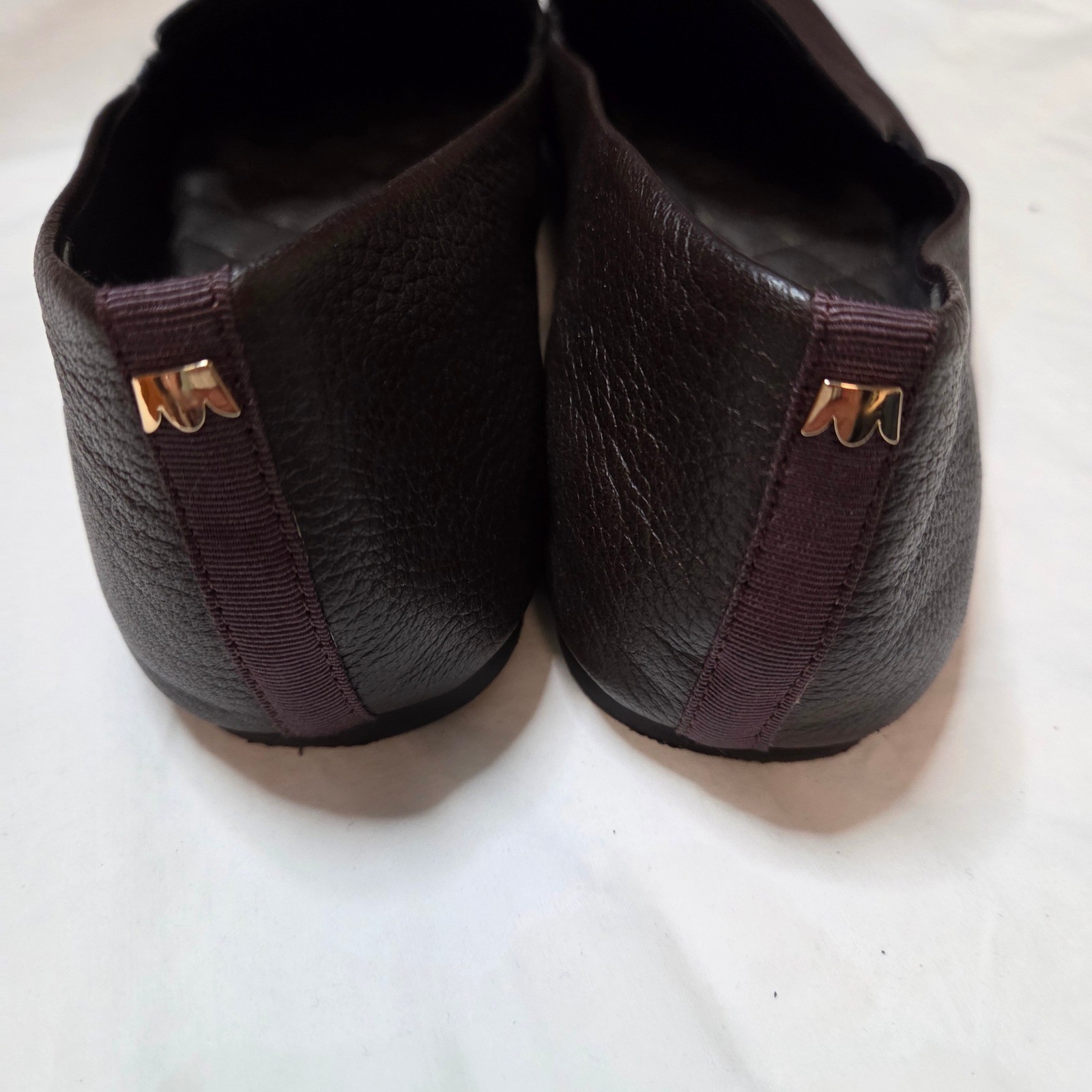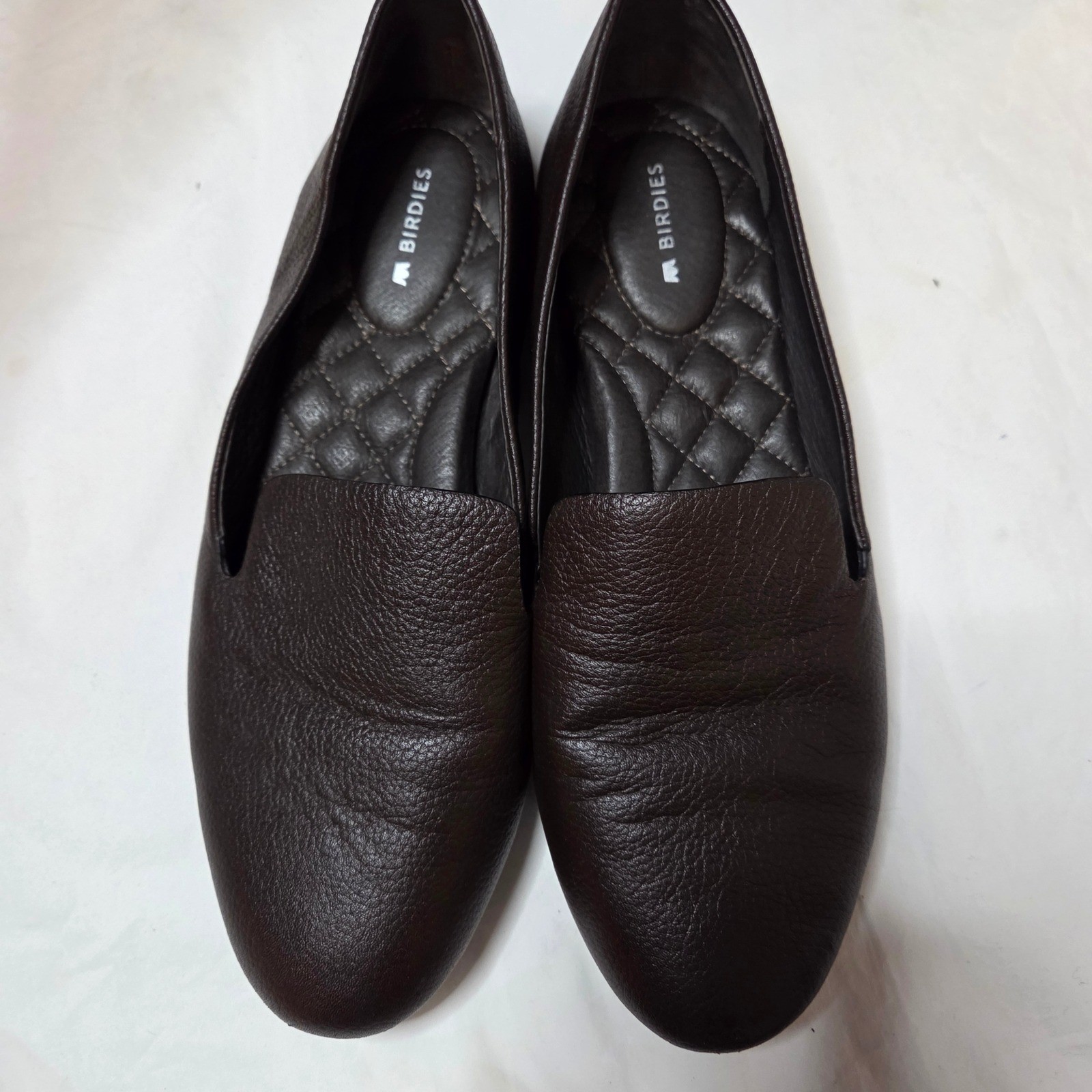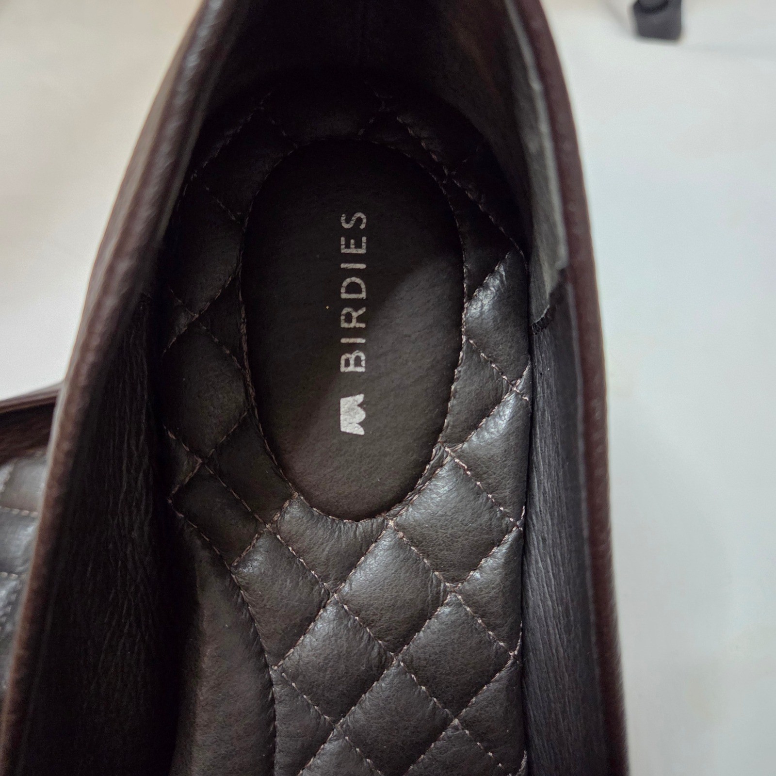 Step into sophisticated comfort with these Birdies The Starling loafers. The rich dark brown pebbled leather upper exudes timeless elegance, while the quilted footbed offers plush cushioning with every stride. Designed for effortless wear, these flats feature a classic loafer silhouette with a subtle V-cut vamp, making them perfect for transitioning from a busy workday to a relaxed evening out. Elevate your everyday style for brunch with friends or a casual stroll through the city. Measurements: • Insole Length: 9.75 in • Insole Width (widest point): 3.25 in • Heel Height: 0.5 in Style: Loafer Department: Women Upper Material: Leather UK Shoe Size: 6.5 AU Shoe Size: 6.5 Features: Padded, Cushioned, Lined Occasion: Workwear, Casual Insole Material: Fabric Lining Material: Leather Outsole Material: Rubber Type: Flat Closure: Slip On Toe Shape: Closed Toe Pattern: Solid Accents: Quilted, Logo Keywords: Birdies loafers, leather flats, quilted interior, pebbled leather, dark brown shoes, womens loafers, comfortable flats, slip on shoes, everyday flats, classic style, business casual, weekend wear