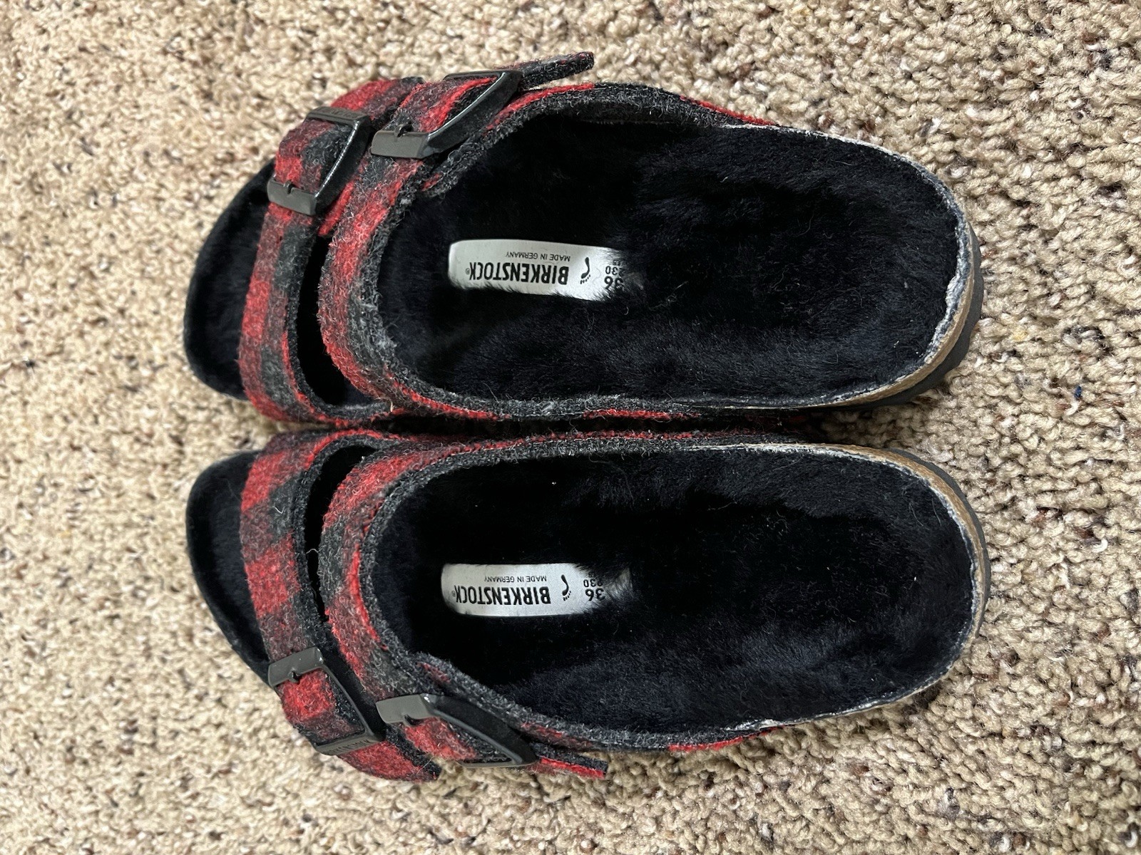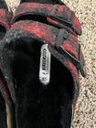 Birkenstock Arizona Shearling Wool Plaid Red Black Sandals Size 36 EU / 5-5.5 US In great preowned condition! Does have some normal, especially on the shearling. Please see all pictures before purchasing. Birkenstock Arizona Shearling Wool Plaid Red—also referred to as the Arizona Shearling in Plaid Red—showcasing its warm plaid wool upper, plush shearling lining, and classic two-strap Arizona silhouette. Product Features The straps are crafted from cozy wool in a red plaid pattern, giving the sandals a festive, seasonal flair perfect for cooler weather. There’s no lining on the underside of the straps to preserve texture. Inside, the cork-latex footbed is lined with soft black shearling (New Zealand lambskin), offering warmth, plush comfort, and natural breathability. Upper: Wool. Footbed: Cork-Latex. Footbed: genuine Shearling. Sole: EVA. Durable EVA outsole