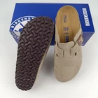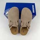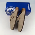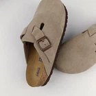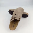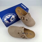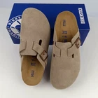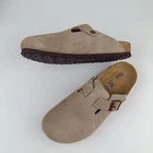 Birkenstock Boston Clogs Taupe Suede Leather Soft Footbed Unisex Men Women Shoes The BIRKENSTOCK Arizona is a genuine classic that has been delighting both men and women for decades. This simple sandal with two straps stands for timeless design and has long held cult status thanks to its comfort factor. The upper is made from the skin-friendly, hard-wearing synthetic material Birko-Flor®. Anatomically shaped cork-latex footbed Upper: Birko-Flor® Footbed lining: suede Sole: EVA Details: two straps, each with an individually adjustable metal pin buckle Upper material: Birko-Flor® Birko-Flor® is a skin-friendly, tear-resistant and easy-to-care-for synthetic material which is exclusively used by BIRKENSTOCK. Insole: Natural leather Natural leather can be recognized by its untreated surface. BIRKENSTOCK purposely does not treat surface grains and other characteristic features. BIRKENSTOCK uses sturdy leather with a thickness of 2.8 to 3.2 millimeters as upper material. Footbed material: Cork Cork is a sustainable material extracted from the bark layer of the cork oak. This natural product is insulating and offers very good cushioning. Outsole: EVA EVA (ethylene vinyl acetate) is a high-quality, very light, elastic material with extremely good cushioning. As a result, it smooths out slight irregularities in the floor and ensures that every step is softly cushioned. NOTE : Please feel free to email me with any questions, and I will respond within 24 hours. I will do my best to resolve any issues you may have. Kindly avoid leaving neutral or negative feedback without contacting me first. Thank you for your understanding, and I hope you have a pleasant shopping experience!