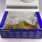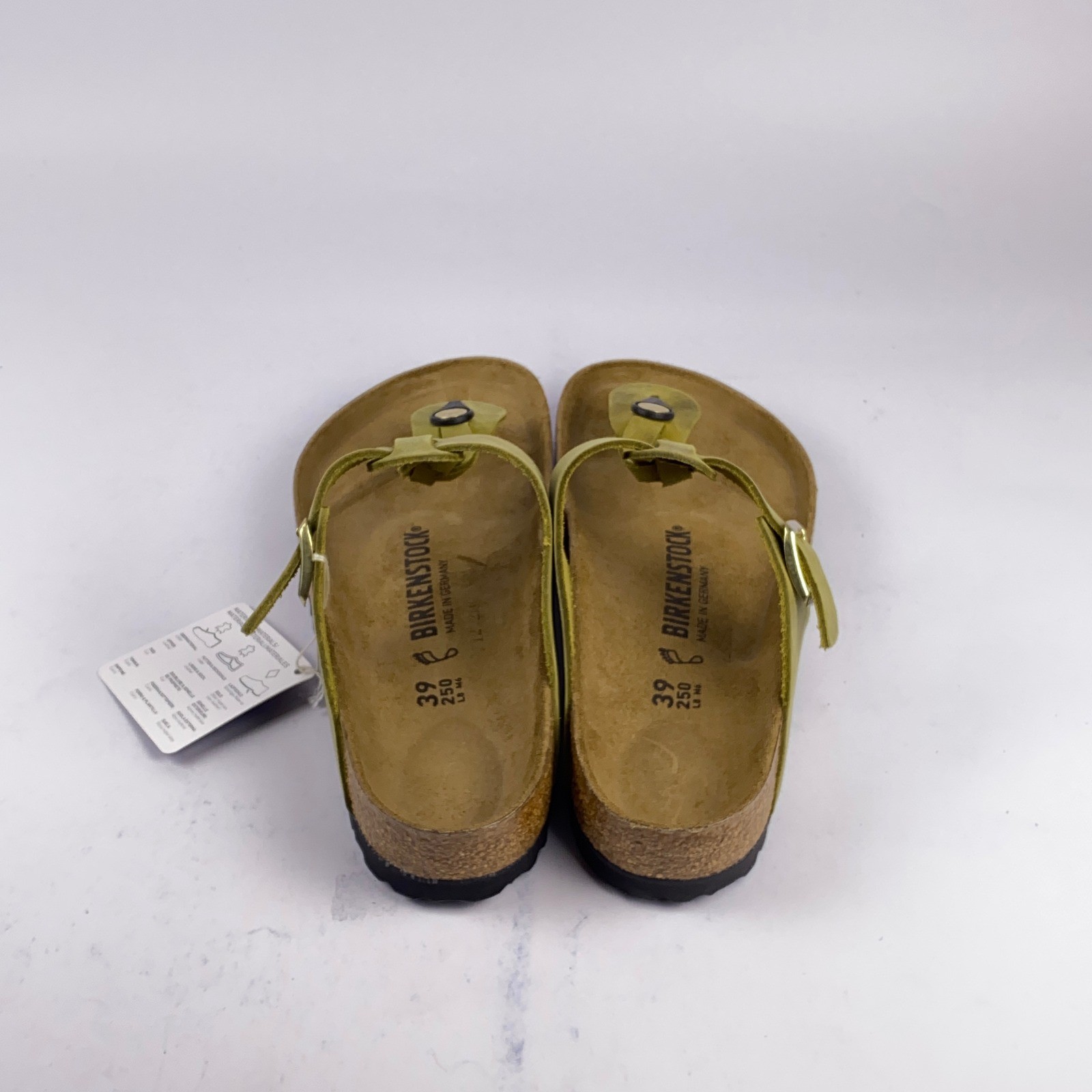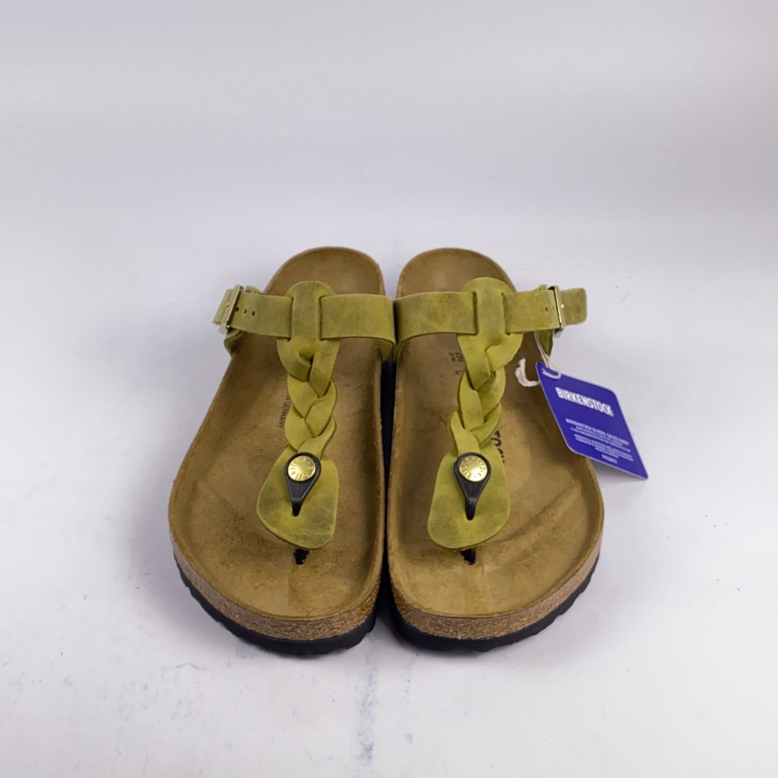 Step into effortless summer style with these exquisite Birkenstock Gizeh Braided sandals. The supple olive green leather is artfully woven into a chic braid, offering a unique and sophisticated look that elevates any outfit. Experience the unparalleled comfort and contoured support of the signature cork footbed, designed to mold to your feet for a truly personalized fit. Adjustable buckle straps ensure a secure and customized feel, while the thong design adds a touch of timeless flair. Perfect for beach strolls, casual outings, or weekend adventures, these sandals promise both fashion and function. Style: Thong Department: Women Upper Material: Leather UK Shoe Size: 5.5 Heel Style: Flat EU Shoe Size: 39 Features: Arch Support, Comfort, Straps, Adjustable Strap, Cushioned Closure: Buckle Pattern: Solid Accents: Medallion Model: Gizeh Braided Heel Height: Flat (Under 1 in) Type: Sandal Keywords: Birkenstock Gizeh, braided leather, olive green sandals, women's thong sandals, cork footbed, adjustable strap, summer footwear, casual sandals, comfortable, stylish, European size 39, US women's 8, designer sandals