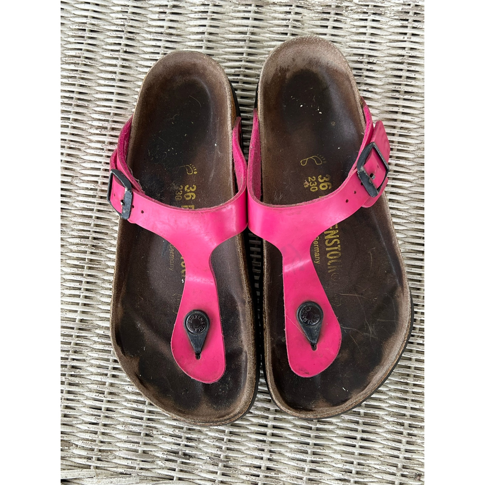 BRAND: Birkenstock SIZE: 36 CONDITION: Preowned Size 36 Preowned Birkenstock Gizeh sandals. There is a little discoloration on the left foot t-strap. Please see photos. There is also a small crack in cork on the right shoe. Please see photos.