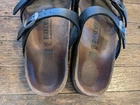 These are in good condition. The buckles do show their age a little bit. You could potentially buff them out if you desire. Please ask if you have any questions. They have plenty of life left in them. The Birkenstock Mayari sandals in size 38 are a versatile choice for travel, activewear, and casual occasions. Made in Germany, these slide-style sandals feature a black Birko-Flor upper material with a metal buckle closure for a secure fit. The classic design includes a graceful pearl finish and a comfortable regular width, suitable for both men and women looking for a stylish and durable sandal option for the summer, fall, and spring seasons.