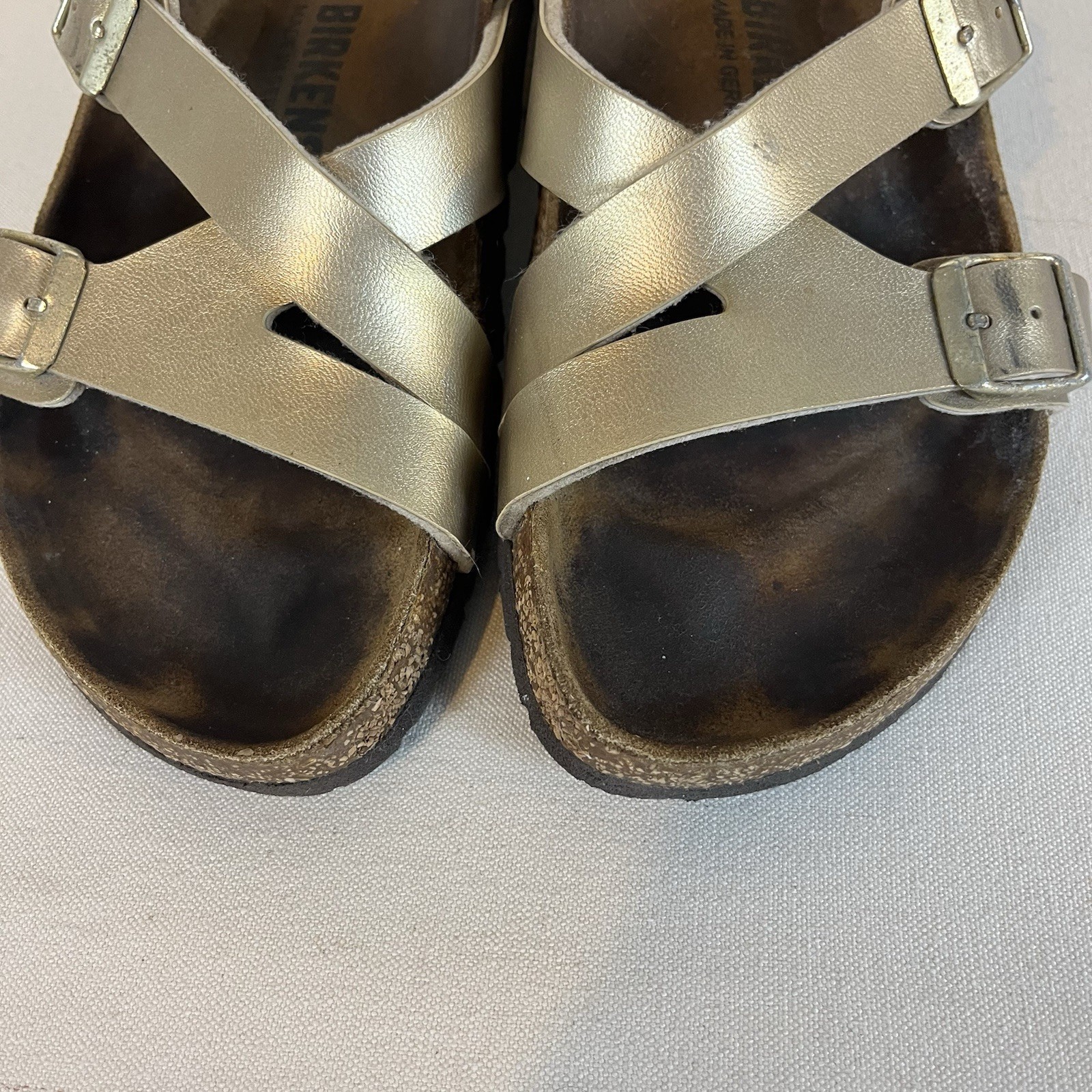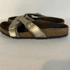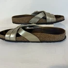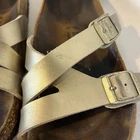 The Birkenstock Yao Balance Women's Size 8 (EU39) Gold Birko Sandals are stylish and comfortable sandals perfect for casual occasions. With a solid gold color and low heel height, these sandals feature a buckle closure and adjustable strap for a secure fit. Made of Birko-Flor upper material and designed with arch support, these sandals are a great choice for women who prioritize both fashion and functionality. The Birkenstock brand is known for its quality and durability, making these sandals a reliable choice for everyday wear. These sandals are preowned, but have lots of life left. Slight mark on left sandal – barely noticeable- see image