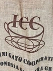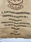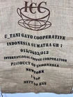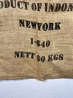 Jute/Burlap Bag. International Coffee Corporation, Product of Indonesia, New York, 60 KGs. Large 29" X 43" Farmhouse, coffee shop decor. In good condition.