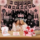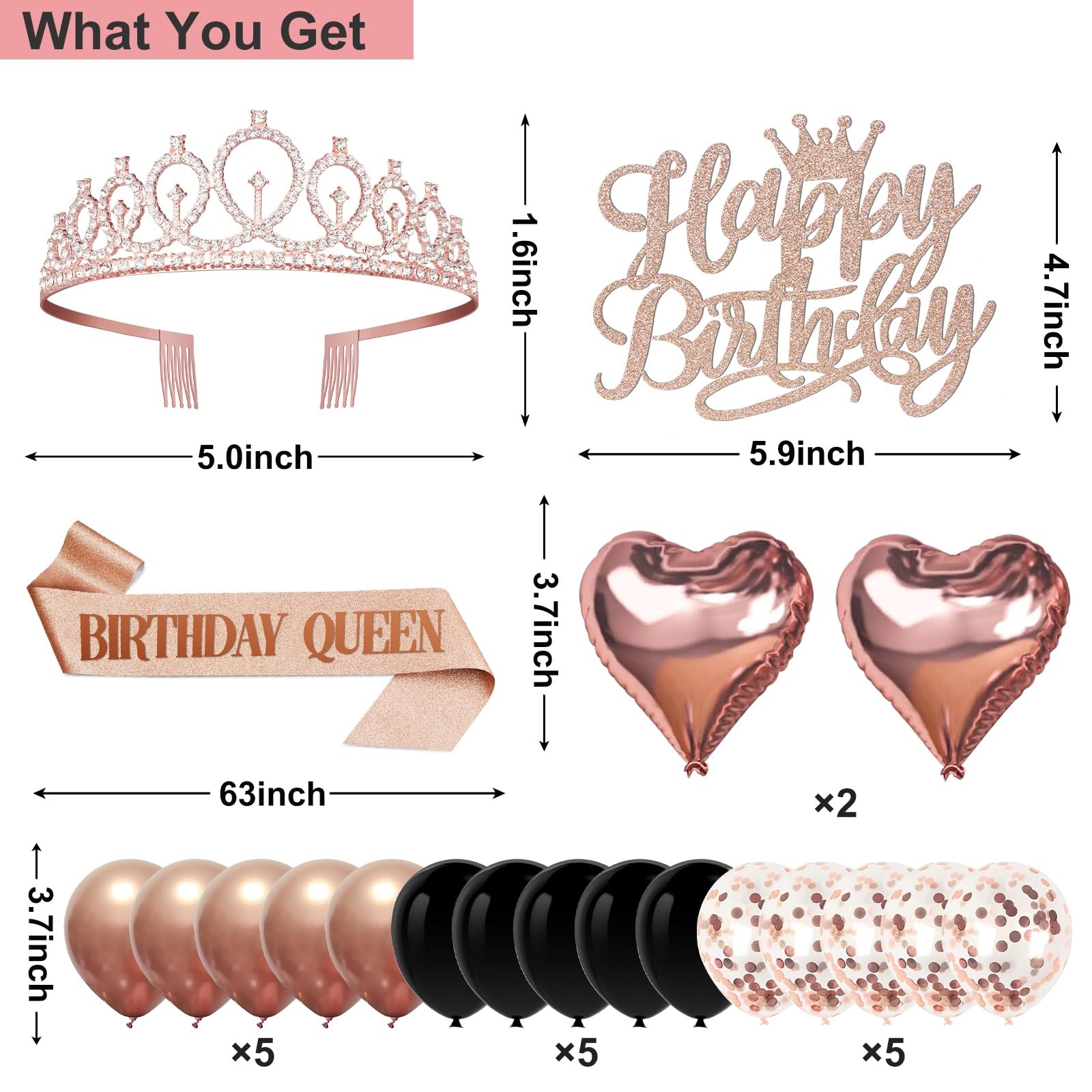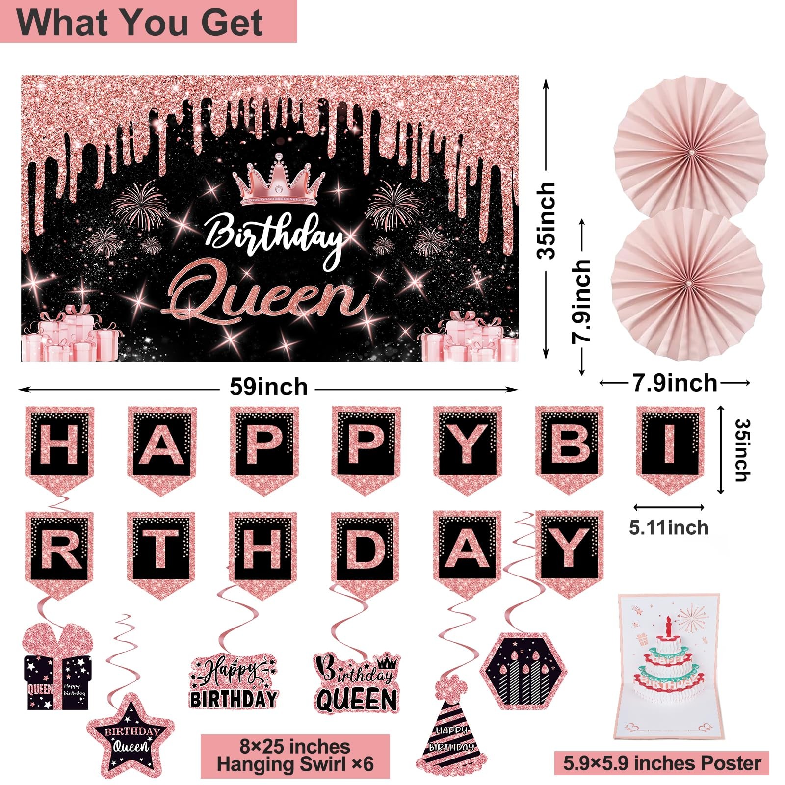 Birthday Decorations for Women,32PCS Birthday Queen Party Decorations,Including Backdrop, Crown, Sash, banner, Hanging Swirl,Cake Topper,balloons,Paper Fans,Anniversary Card and paper fans Birthday Queen Decorations Kit:Including 1pc Birthday Queen Black Rose Gold Banner Backdrop,1pc Birthday tiara,1pc Birthday Queen sash and a pin,1pc happy birthday banner,7pcs Hanging Swirl,1pc happy birthday cake topper,1set Love Shape balloons,15pcs latex balloons,1pc happy birthday Card and 2pcs paper fans.The perfect combination of multiple items easily creates a rich birthday atmosphere for your party. Birthday Queen banner backdrop:The birthday backdrop is 59x35 inches,be printed by quality digital resolution and it is large for Black Rose Gold party theme color.There are copper holes on the four corners of the happy birthday banner, you can hang it on anywhere you want.Can be reused several times in different occasions. Birthday Tiara+Sash:Elegant and gorgeous birthday sash is made from glitter fabric and printed with rose gold words.The sash is in 62 inch length and comes with a pin for adjusting the length in need. Hand Made Glittery Crown is Made from quality alloy and rhinestone. Birthday Tiara is with Combs at the end of both side, which Make sure it can grip the hair more tightly and comfortable to fit most women. Happy birthday cake topper:Glittery Happy Birthday Cake Topper that are elegant prop to embellish your cake and cupcake. These dreamy Rose Gold Birthday kit help to create a romantic and elegant birthday celebration. Happy birthday banner+Glittery Hanging Swirl:Use black gold background cloth as the perfect shooting background, Install the flash suspension vortex and banner.Use them to create the memorable event and boost a happy atmosphere for your friends and family, This will be a perfect way to take pictures at a party. Balloons+paper fans:Balloons come with straw to inflate, Made of sturdy mylar foil material to stand the long-hour display.There are also fifteen rose and gold latex balloons each, enough items to decorate your party.The paper fans unique backdrop for Birthday Party.