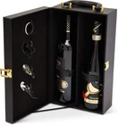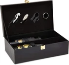 Black 2 Bottle Wine Carrier Case with 4 Piece Accessory Set Product Details HANDCRAFTED WINE CARRIER! Today is the day you learn you need a wine box in your life! Our product has a gorgeous leather exterior, soft-lined interior, and the capacity for two bottles of wine + included bar tools! You are not getting this phenomenal deal anywhere else! A strong comfortable handle and a secure latch to make walking with our box simple! Perfect gift for wine lovers! Grab our box, your favorite wine, a blanket, and go for a picnic! Dimensions: 14.5 W × 8.0 D × 4.75 H PREMIUM LEATHER! Our wine box has a premium dark leather exterior giving a luxurious look and feel! The stitching is bright white for a gorgeous contrast and fresh vibe! From the handle, corners, and interior you can tell this product is well crafted! Every wine enthusiast/lover needs our wine box! Especially for nights at friends, gifts, and cute sunset picnics! The handle is comfortable to carry and transport! EXQUISITE GIFT! Do you want to go above and beyond for your gifts this year?! Consider our extraordinary wine box! Simply observe our photographs and know the luxurious quality of the product you are about to receive! Our wine box is unique that it fits TWO 750ml bottles of wine with bonus bar accessories and extra space! This product makes the perfect wedding gift, house warming gift, or anniversary gift! Set up a cute date with your partner with favorite wine and snacks! EXTRA ACCESSORIES INCLUDED! Who doesn't love bonus gifts?! We couldn't give you a wine box without a set of all the necessary wine tools! Look forward to getting a corkscrew, foil cutter, neck cleaner, and spout with a stopper! Never forget to pack any of these since they come with the package and fit perfectly in the box! Our product makes sure you have everything you need for a wonderful night! Pop those bottles and have a blast with friends and family!