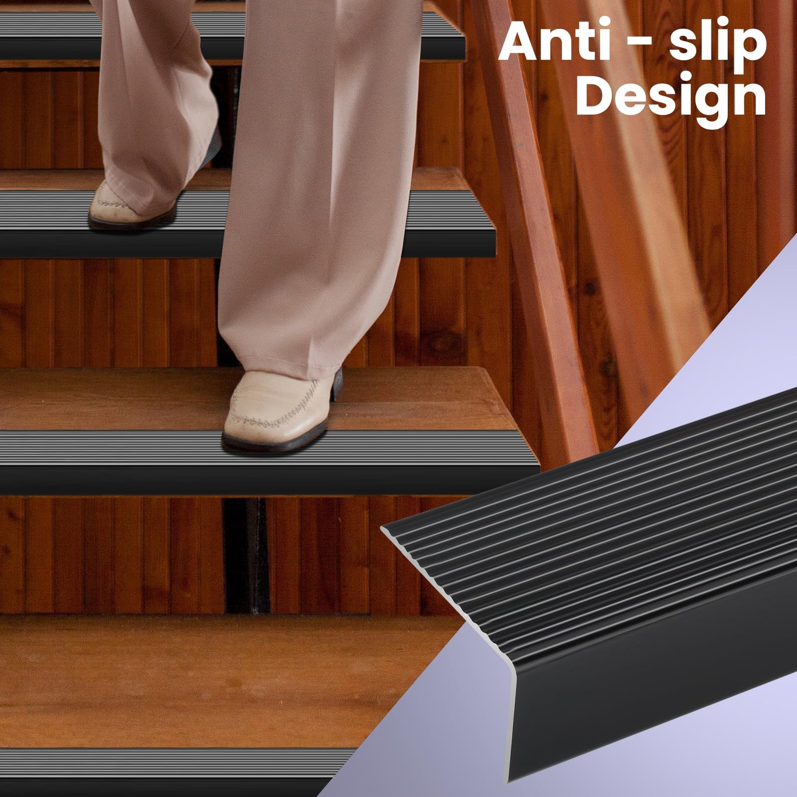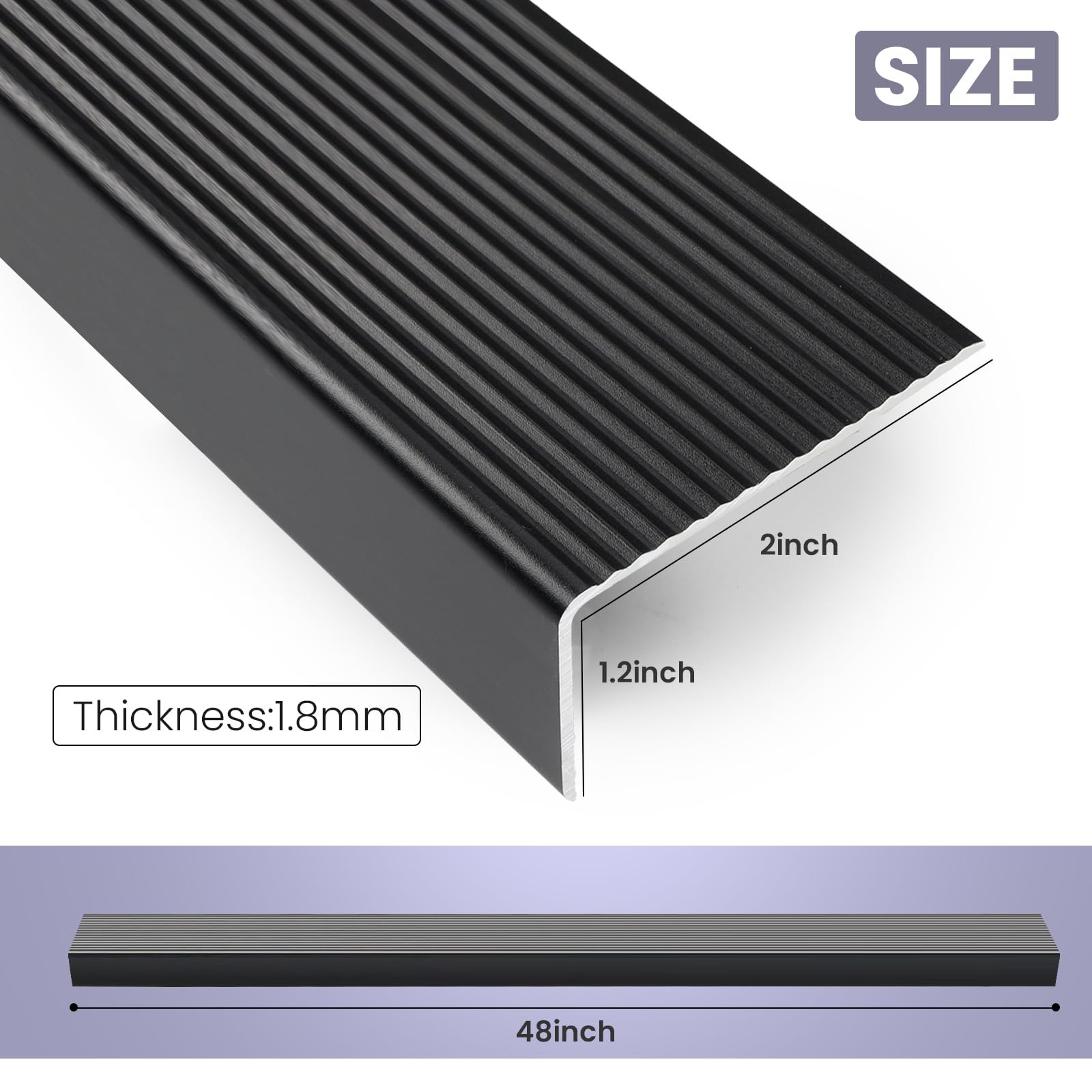 Black 48" Metal Stair Nosing, Heavy-Duty Aluminum Self-Adhesive Stair Edging Protector for Indoor Outdoor Stairs, Non-Slip Tread Cover, L- Molding(48in x 2in x 1.2 in, 2Pcs) Ultimate Non-Slip& Safety: Featuring a textured surface, this stair edge trim enhances friction on steps, reducing slip risks in wet conditions. For homes, decks, and commercial spaces, ensuring safe passage for kids, elder and pets Heavy-Duty Aluminum: Constructed from rust-resistant anodized aluminum, this trim withstands heavy foot traffic, sunshine exposure, and harsh weather. Maintains structural integrity without warping or corrosion Self-Adhesive Installation in Minute: Pre-coated with industrial-strength adhesive for instant mounting—no drilling or tools required. Simply clean the surface, peel the backing, and press firmly. Compatible with tile, wood, concrete, vinyl and any stairs Versatile Indoor and Outdoor Protection: Protects stair edges from chips, cracks, and wear Suitable for both residential and commercial use. Metal finish blends elegantly with any décor Pedestrians,Workers,Kids,Senior&Pet-Friendly Edge Guard:Non slip prevent injuries and stairs damage. The textured design avoids tripping hazards, making it a practical safety upgrade for households with active families and work places, commercial places
