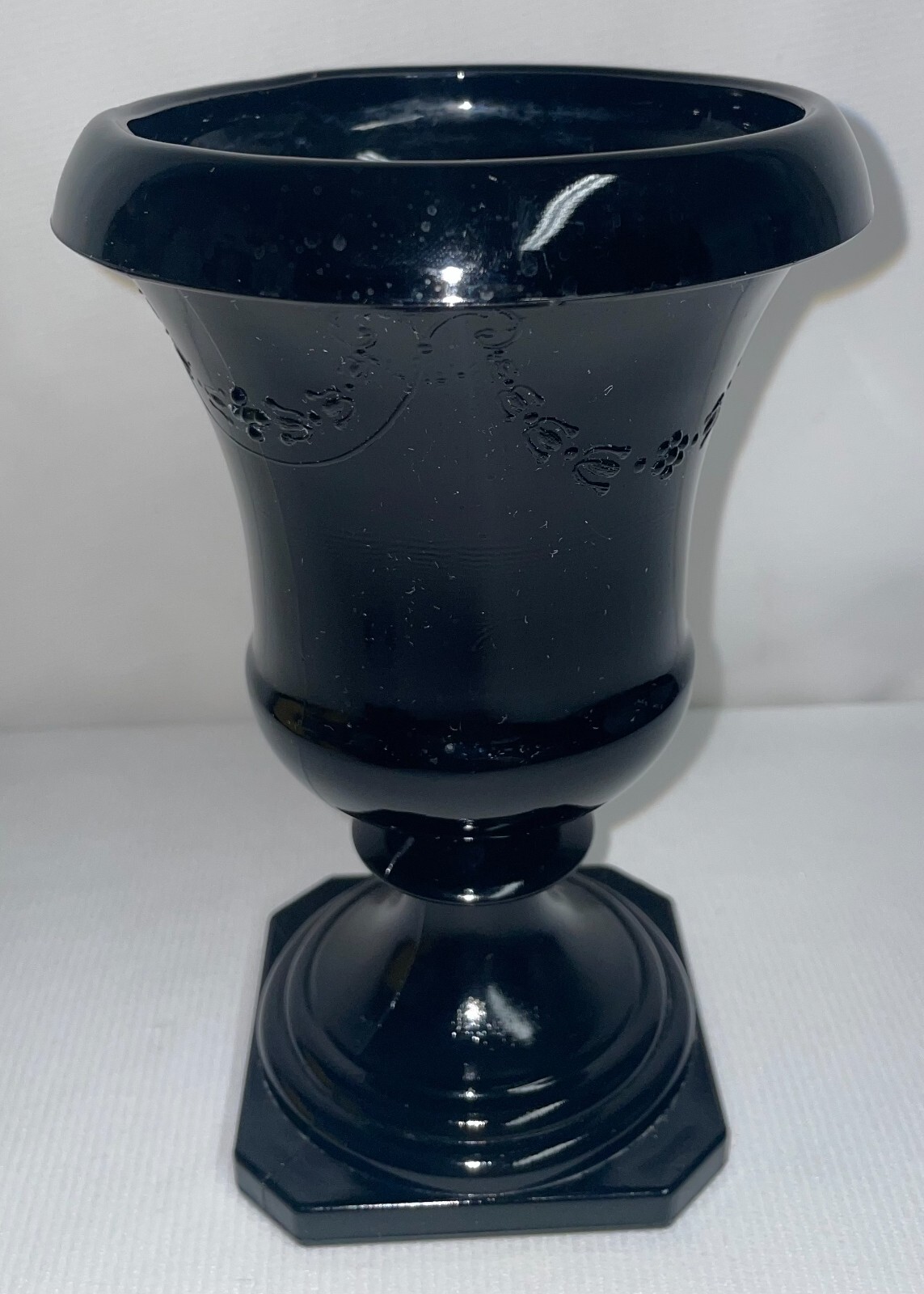 Black Amethyst Glass Pedestal Urn Vase Garland Pattern 7 Inches High. Pre-owned, no chips or cracks, A beautiful garland pattern. The urn measures 7 inches high with a 5 inch opening across top. The base measures 4 inches square. The purple shows through under flash light. Hand wash only. ATTENTION REGARDING SHIPPING !! Shipping costs are expensive. Here is an offer that is hard to refuse. If you buy 2 or more items totaling $50 or more , I will handle the shipping cost (ground) anywhere in the continental United States. The items cannot be listed as having to be shipped alone due to SPECIAL PACKING NEEDS . eBay does not adjust the shipping cost removal from the invoice automatically. I can do it on the final invoice after you have the items in your shopping basket, before you pay. If eBay forces payment before that is done, you will receive a refund of shipping cost made before your package is shipped within the first business day following the transaction. The free shipping offer does not apply to Priority or Expedited shipping, although we can discuss a fair reduction in shipping cost should you desire the shipping upgrade. LOOKING FOR LESS EXPENSIVE SHIPPING? Click on "See details" next to Expedited Shipping Fee above to see other shipping options. eBay calculates the shipping fee based on package size, weight and type of shipping you select. SOME ITEMS CANNOT BE COMBINED WITH OTHER ITEMS DUE TO UNIQUE PACKAGING CHARACTERISTICS. THERE WILL BE A NOTE (here) IN THE LISTING WHEN COMBINED SHIPPING CANNOT BE USED. SAVE SHIPPING COSTS! – USE COMBINED SHIPPING Shipping costs are high. The best way to save money on shipping costs is through combined shipping,… purchasing more than 1 item and having them shipped together. The cost per item drops substantially. To do this you MUST NOT pay for items until after the combined shipping cost has been calculated on the invoice. If you pay before this has been done you will end up paying the individual shipping cost for each item, and I am unable to issue refunds for shipping overpayments when this occurs because eBay does not refund the fees they charge me on the refunded amount.