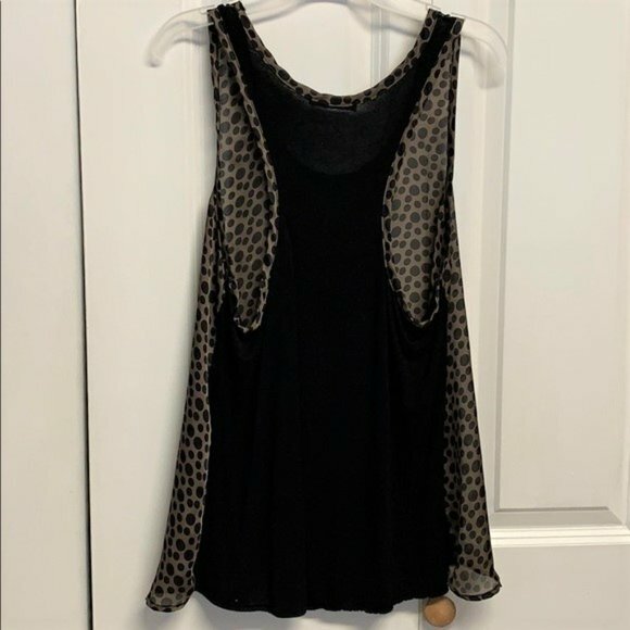 This trendy Timing tank top is perfect for any occasion, featuring a round neckline and pullover closure. The lightweight, collarless top is made from a soft polyester and viscose material with a polka dot pattern and slit sleeves. The wide straps and sheer fabric make it perfect for summer and spring, and it's available in a regular fit for size S. The tank top is easy to care for and preshrunk, making it a great addition to any wardrobe. Whether you're dressing it up for a party or wearing it to work, the baguette, hippie, punk, geek, grunge, city, classic, nerd, retro, preppy, modern, hipster, designer, peasant, and hip hop theme options give you plenty of outfit options . Run in the front other than that good preowned Condition no fabric Tags front feels like a sheer polyester back feels like a soft stretch rayon 26’ around armholes 18 .50’ across chest 44’ around bottom 25.50’ long from collar seams to bottom front nice for casual wear