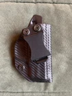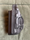This Black Carbon Fiber Kydex IWB Holster is designed specifically for the Smith & Wesson M&P Shield (1.0) 3.1" barrel pistol. This concealment holster is made of Kydex material in a sleek black color with a carbon fiber pattern. It is intended for inside waistband (IWB) carry, providing a secure and comfortable fit for the firearm during shooting activities. This holster is ideal for those looking for a reliable and discreet way to carry their Smith & Wesson M&P Shield.