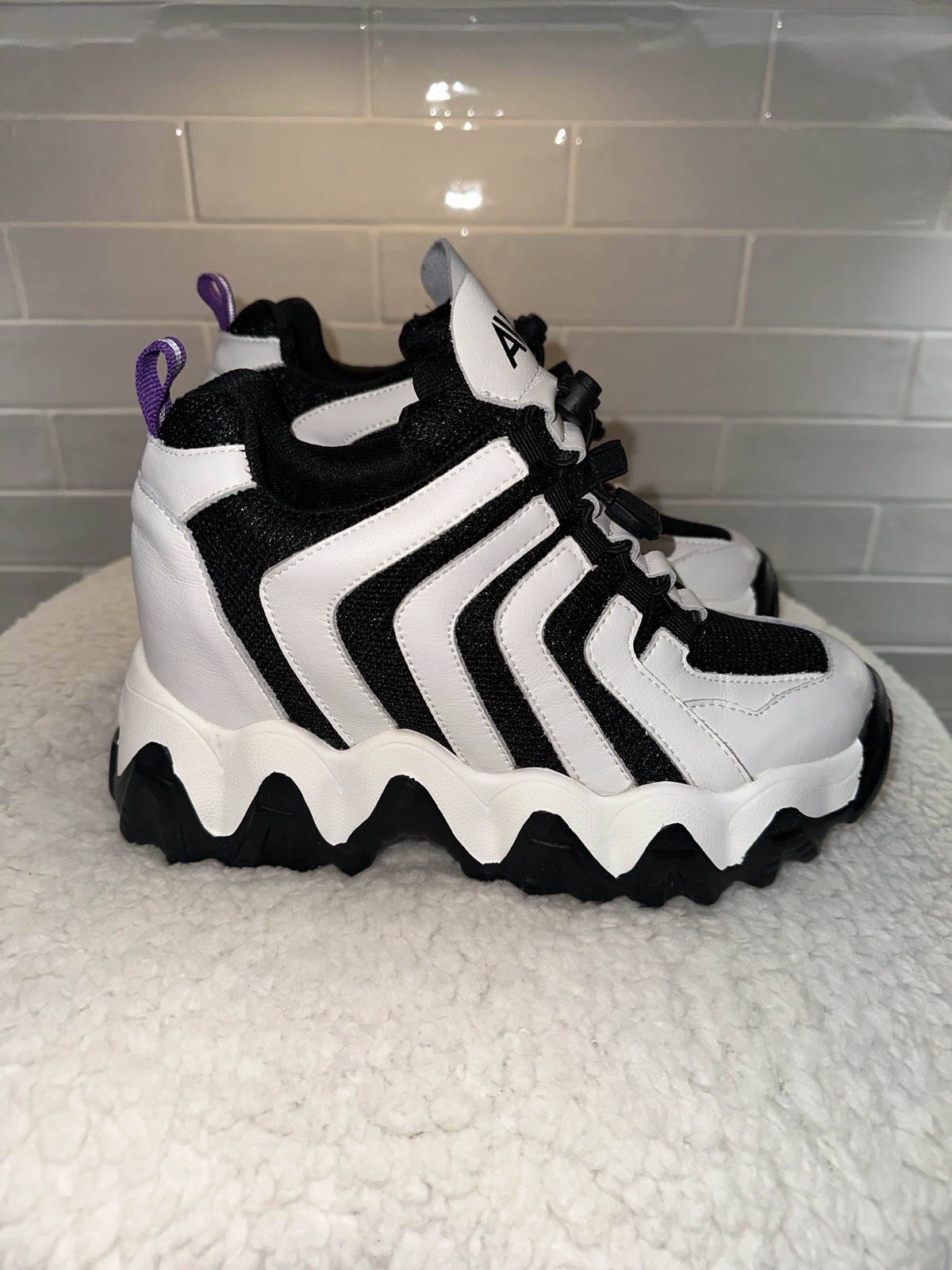 The Black Chevron Blackberry Platform Sneakers by Anthony Wang in size 8 are stylish and versatile shoes suitable for casual and business occasions. Featuring a round toe shape, lace-up closure, and wedge heel style, these platform sneakers offer comfort and style. The black color and street-inspired design make them perfect for the summer, fall, and spring seasons. These shoes are a fashionable choice for women looking to elevate their casual or business attire.