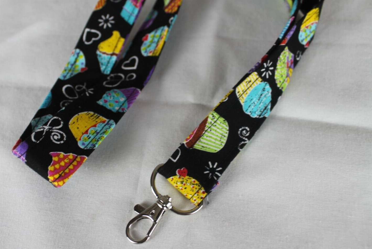 CUPCAKE PRINT BLACK COLORFUL HANDMADE COTTON LANYARD W/ SWIVEL J HOOKS ID CARDS Lanyards for ID Badge Holder Lanyard Strap with Stainless Metal Swivel J-Hook Name Tags Badge for Name Tag Badge Holders, Key chains, Access Card 21" LONG FULL LENGTH TO END OF CLASP 1" WIDE WILL COMBINE SHIPPING ON MULTIPLE ORDERS, BUY MORE, SAVE MORE