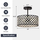 Black Crystal Ceiling Light Fixture,12 Inch Small Semi Flush Mount Ceiling Light Fixture,Small Round Hallway Light fixtures for Entryway,Laundry Room,Kitchen,Bedroom Size and Materials: The crystal semi-flush mount ceiling light measures 12 inches in diameter and 10.5 inches in height. This crystal ceiling light is finely made, with a solid and long-lasting structure E12 Base Socket: The crystal ceiling light compatible with E12 bulb x 3(max 60 watts), compatible with Incandescent, LED, CFL and halogen bulbs are all compatible, (Bulbs NOT included) High Translucency Crystal: The semi flush mount ceiling light comes wirh K9 crystal, the crystal material used allows for high light transmittance, with black light fixture metal frame, the ceiling light will refract luxurious and special light through the crystal to the surrounding of the ceiling Easy Installation: This modern recessed ceiling light is simple to install, requiring no complicated setup process, and bulb replacement is a breeze. It comes with all necessary mounting hardware and an installation manual for quick setup. Be sure to turn off the power before installation to ensure safety Dimmable: Designed to be dimmable when used with a compatible dimmer switch ( not included ), allowing you to adjust the preferred light brightness. Ideal for hallway, entryway, bathrrom, bedroom, kitchen, dining room,balcony, foyer, etc